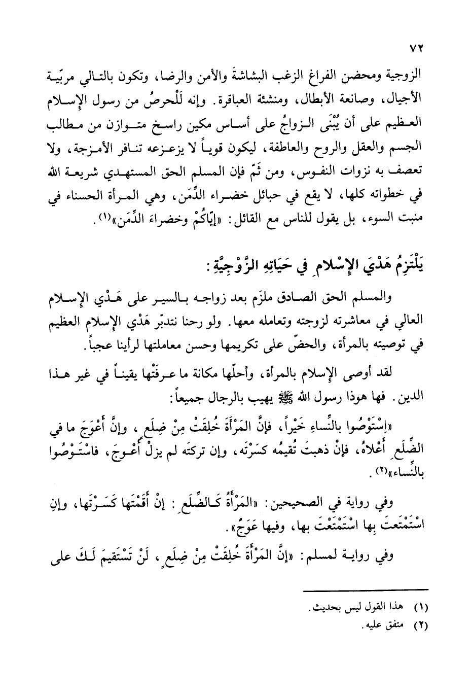 الزوجية ومحضن الفراغ الزغب البشاشة والأمن والرضا، وتكون بالتالي مربية الأجيال، وصانعة الأبطال، ومنشئة العباقرة. وإنه للحرص من رسول الإسلام العظيم على أن يبنى الزواج على أساس مكين راسخ متوازن من مطالب الجسم والعقل والروح والعاطفة، ليكون قويا لا يزعزعه تنافر الأمزجة، ولا تعصف به نزوات النفوس، ومن هنا كان المسلم الحق المستهدي شريعة الله في خطواته كلها بصيرا، لا يقع في حبائل خضراء الدمن، وهي المرأة الحسناء في منبت السوء، بل يقول للناس مع القائل: ((إياكم وخضراء الدمن)) (¬1).