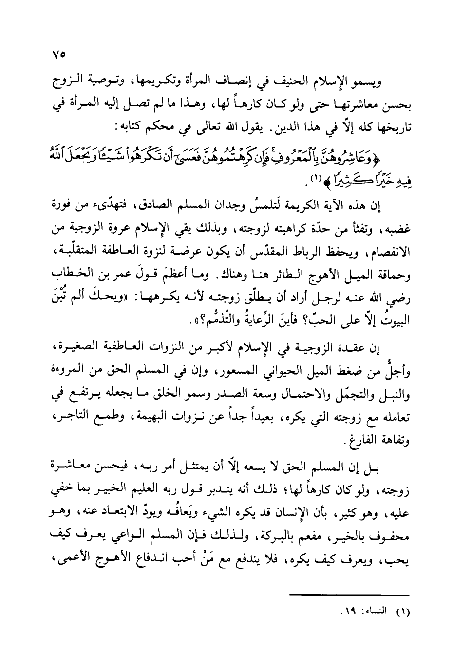 إن هذه الآية الكريمة لتلمس وجدان المسلم الصادق، فتهدئ من فورة غضبه، وتفثأ من حدة كراهيته لزوجته، وبذلك يقي الإسلام عروة الزوجية من الانفصام، ويحفظ الرباط المقدس أن يكون عرضة لنزوة العاطفة المتقلبة، وحماقة الميل الأهوج الطائر هنا وهناك. وما أعظم قول عمر بن الخطاب رضي الله عنه لرجل أراد أن يطلق زوجته لأنه يكرهها: ((ويحك ألم تبن البيوت إلا على الدين؟ فأين الرعاية والتذمم؟)).