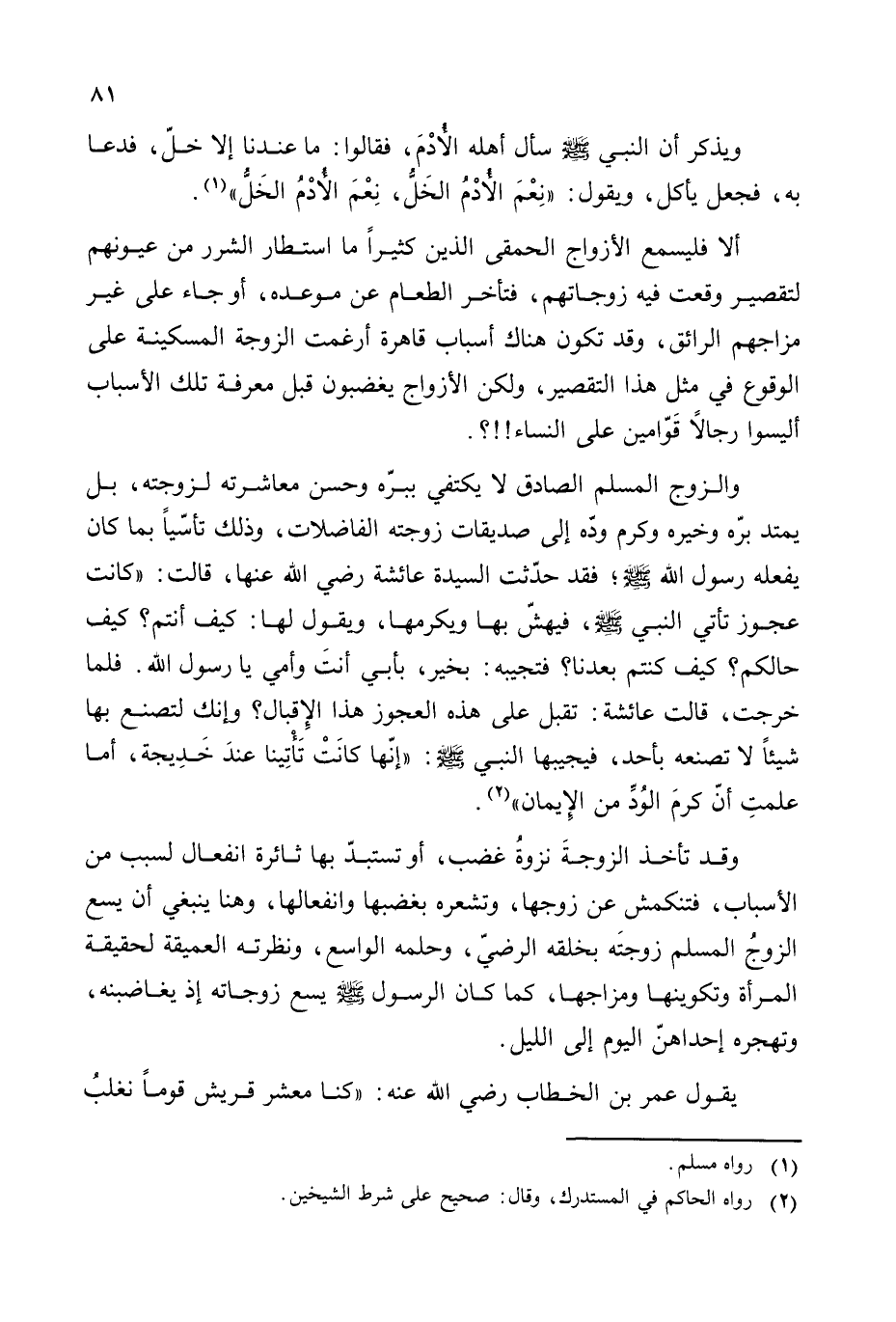 وقد تأخذ الزوجة نزوة غضب، أو تستبد بها ثائرة انفعال لسبب من الأسباب، فتنكمش عن زوجها، وتشعره بغضبها وانفعالها، وهنا ينبغي أن يسع الزوج المسلم زوجته بخلقه الرضي، وحلمه الواسع، ونظرته العميقة لحقيقة المرأة وتكوينها ومزاجها، كما كان الرسول - صلى الله عليه وسلم - يسع زوجاته إذ يغاضبنه، وتهجره إحداهن اليوم إلى الليل.