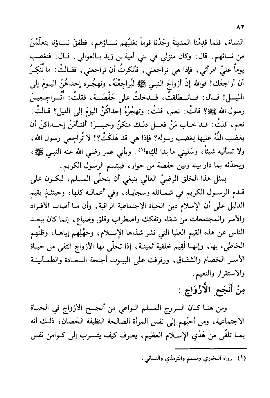النساء فلما قدمنا المدينة وجدنا قوما تغلبهم نساؤهم، فطفق نساؤنا يتعلمن من نسائهم. قال: وكان منزلي في بني أمية بن زيد بالعوالي. قال: فتغضب يوما على امرأتي، فإذا هي تراجعني، فأنكرت أن تراجعني، فقالت: ما تنكر أن أراجعك! فوالله إن أزواج النبي - صلى الله عليه وسلم - ليراجعنه، وتهجره إحداهن اليوم إلى الليل! قال: فانطلقت، فدخلت على حفصة، فقلت: اتراجعين رسول الله - صلى الله عليه وسلم -؟ قالت: نعم، قلت: وتهجره إحداكن اليوم إلى الليل؟ قالت: نعم، قلت: قد خاب من فعل ذلك منكن وخسر! أفتأمن إحداكن أن يغضب الله عليها لغضب رسوله؟ فإذا هي قد هلكت؟! لا تراجعي رسول الله، ولا تسأليه شيئا، وسليني ما بدا لك)) (¬1). ويأتي عمر رضي الله عنه النبي - صلى الله عليه وسلم -، ويحدثه بما دار بينه وبين حفصة من حوار، فيبتسم الرسول الكريم.