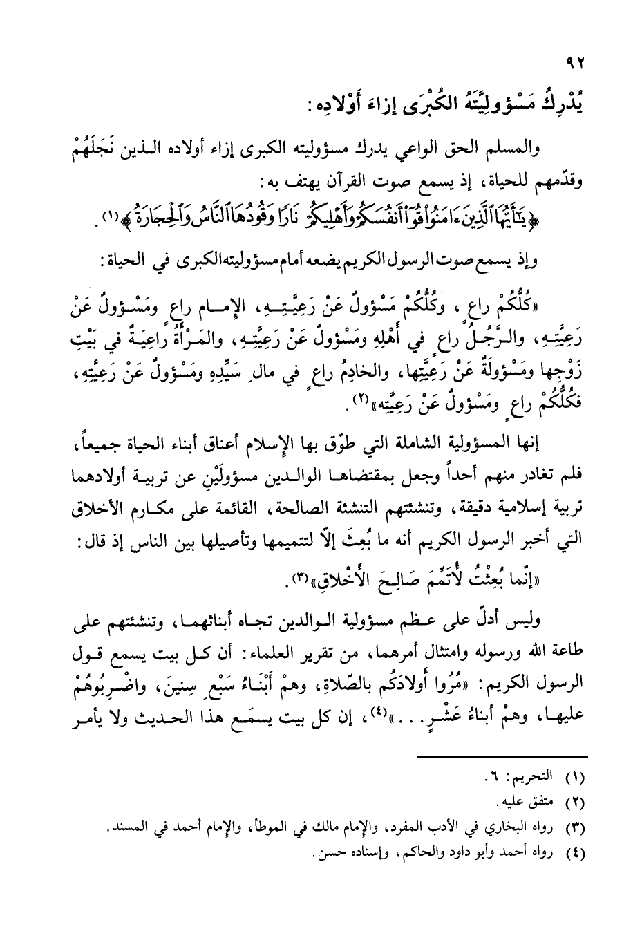 إنها المسؤولية الشاملة التي طوق بها الإسلام أعناق أبناء الحياة جميعا، فلم تغادر منهم أحدا، وجعل بمقتضاها الوالدين مسؤولين عن تربية أولادهما تربية إسلامية دقيقة، وتنشئتهم التنشئة الصالحة، القائمة على مكارم الأخلاق التي أخبر الرسول الكريم أنه ما بعث إلا لتتميمها وتأصيلها بين الناس إذ قال: ((إنما بعثت لأتمم صالح الأخلاق)) (¬3).