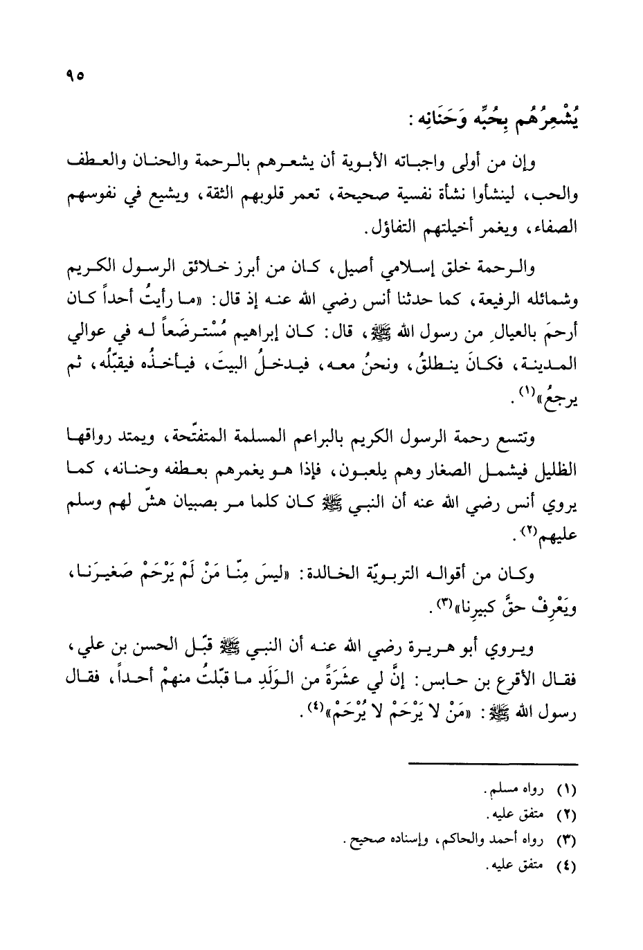ويروي أبو هريرة رضي الله عنه أن النبي - صلى الله عليه وسلم - قبل الحسن بن علي، فقال الأقرع بن حابس: إن لي عشرة من الولد ما قبلت منهم أحدا، فقال رسول الله - صلى الله عليه وسلم -: ((من لا يرحم لا يرحم)) (¬4).