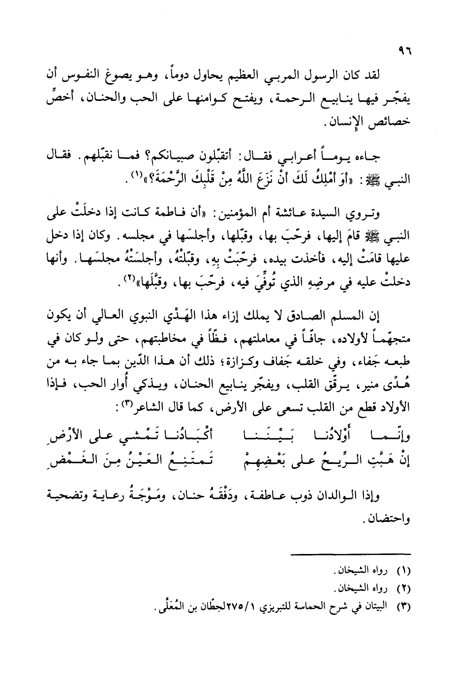 إن المسلم الصادق لا يملك إزاء هذا الهدي النبوي العالي أن يكون متجهما لأولاده، جافا في معاملتهم، فظا في مخاطبتهم، حتى ولو كان في طبعه جفاء، وفي خلقه جفاف وكزازة؛ ذلك أن هذا الدين بما جاء به من هدى منير، يرقق القلب، ويفجر ينابيع الحنان، ويذكي أوار الحب، فإذا الأولاد قطع من القلب تسعى على الأرض، كما قال الشاعر (¬3):