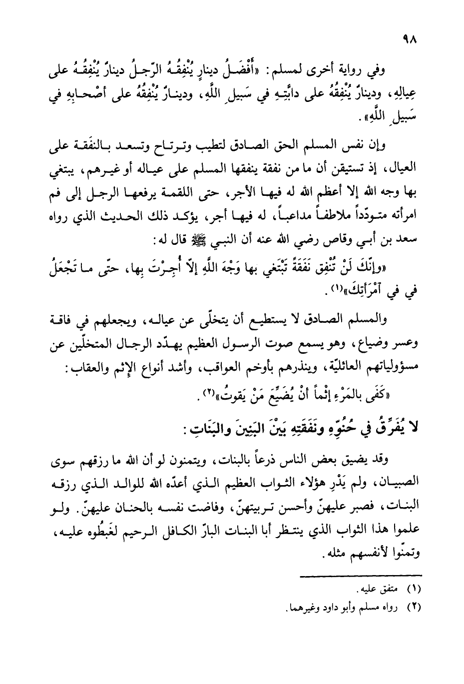 وإن نفس المسلم الحق الصادق لتطيب وترتاح وتسعد بالنفقة على العيال، إذ تستيقن أن ما من نفقة ينفقها المسلم على عياله أو غيرهم، يبتغي بها وجه الله إلا أعظم الله له فيها الأجر، حتى اللقمة يرفعها الرجل إلى فم امرأته متوددا ملاطفا مداعبا، له فيها أجر، يؤكد ذلك الحديث الذي رواه سعد بن أبي وقاص رضي الله عنه أن النبي - صلى الله عليه وسلم - قال له:
