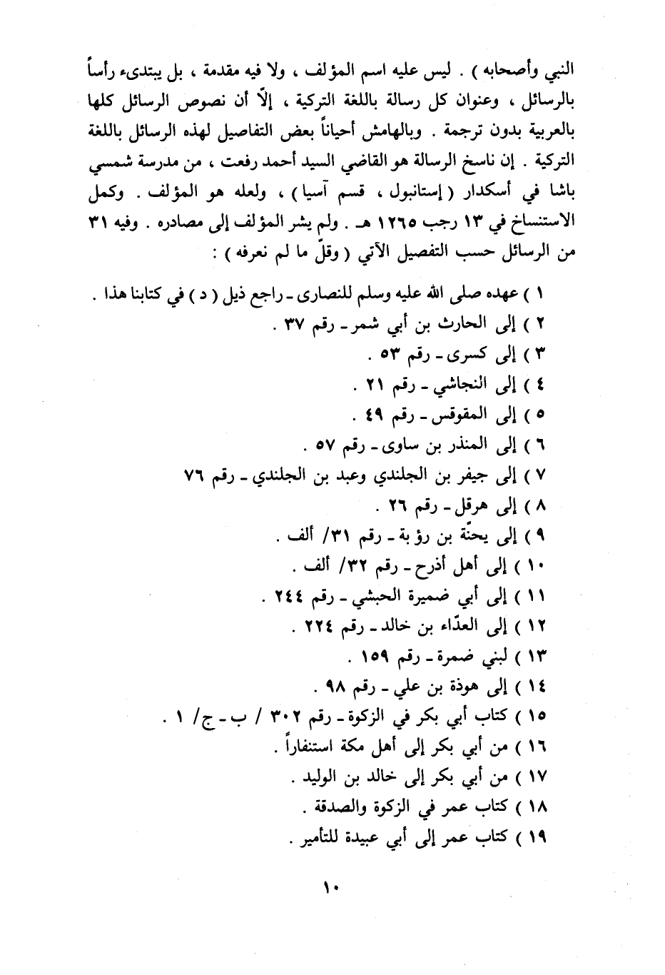 النبي وأصحابه) . ليس عليه اسم المؤلف، ولا فيه مقدمة، بل يبتدىء رأسا بالرسائل، وعنوان كل رسالة باللغة التركية، إلّا أن نصوص الرسائل كلها بالعربية بدون ترجمة. وبالهامش أحيانا بعض التفاصيل لهذه الرسائل باللغة التركية. إن ناسخ الرسالة هو القاضي السيد أحمد رفعت، من مدرسة شمسي باشا في أسكدار (إستانبول، قسم آسيا) ، ولعله هو المؤلف. وكمل الاستنساخ في 13 رجب 1265 هـ. ولم يشر المؤلف إلى مصادره. وفيه 31 من الرسائل حسب التفصيل الآتي (وقلّ ما لم نعرفه) :