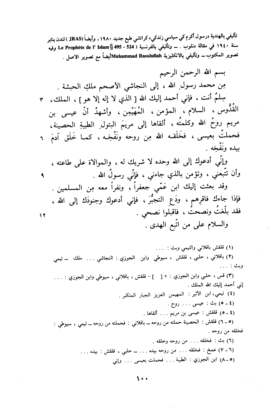 تأليفي بالهندية «رسول أكرم كي سياسي زندكي» كراتشي طبع جديد 1980، وأيضا) JRAS (لندن يناير سنة 1940 في مقالة دنلوب. - وتأليفي بالفرنسية) 425 -594 Le Prophete de iIslam (وفيه تصوير المكتوب- وتأليفي بالانكليزية Muhammad Rasulullah أيضا مع تصوير الاصل.