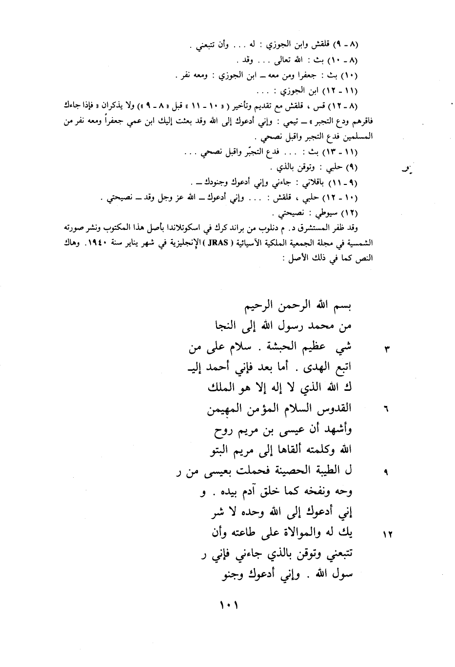 (8- 12) قس، قلقش مع تقديم وتأخير ( «10- 11» قبل «8- 9» ) ولا يذكران «فإذا جاءك فاقرهم ودع التجبر» - تيمي: وإني أدعوك إلى الله وقد بعثت إليك ابن عمي جعفرا ومعه نفر من المسلمين فدع التجبر واقبل نصحي.