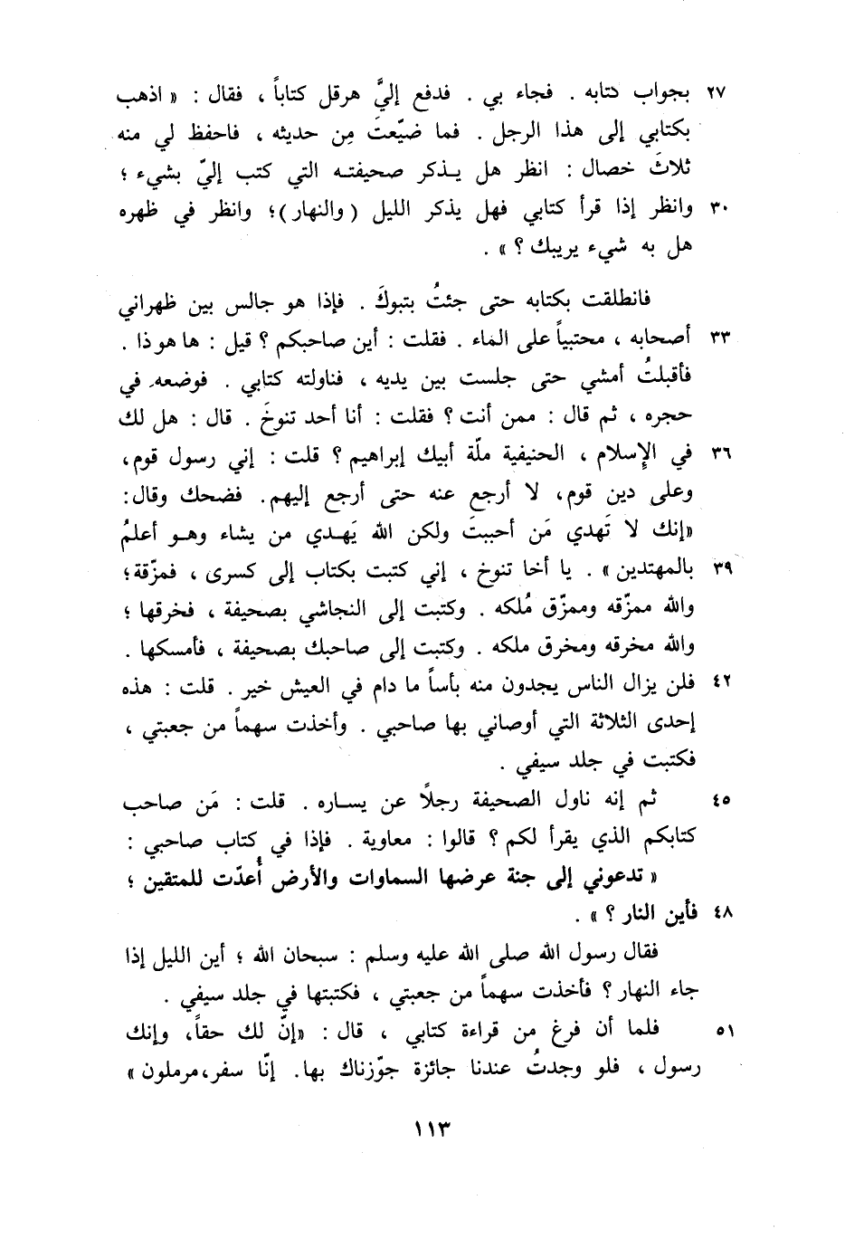 «إنك لا تهدي من أحببت ولكن الله يهدي من يشاء وهو أعلم بالمهتدين» . يا أخا تنوخ، إني كتبت بكتاب إلى كسرى، فمزّقة؛ والله ممزّقه وممزّق ملكه. وكتبت إلى النجاشي بصحيفة، فخرقها؛ والله مخرقه ومخرق ملكه. وكتبت إلى صاحبك بصحيفة، فأمسكها.