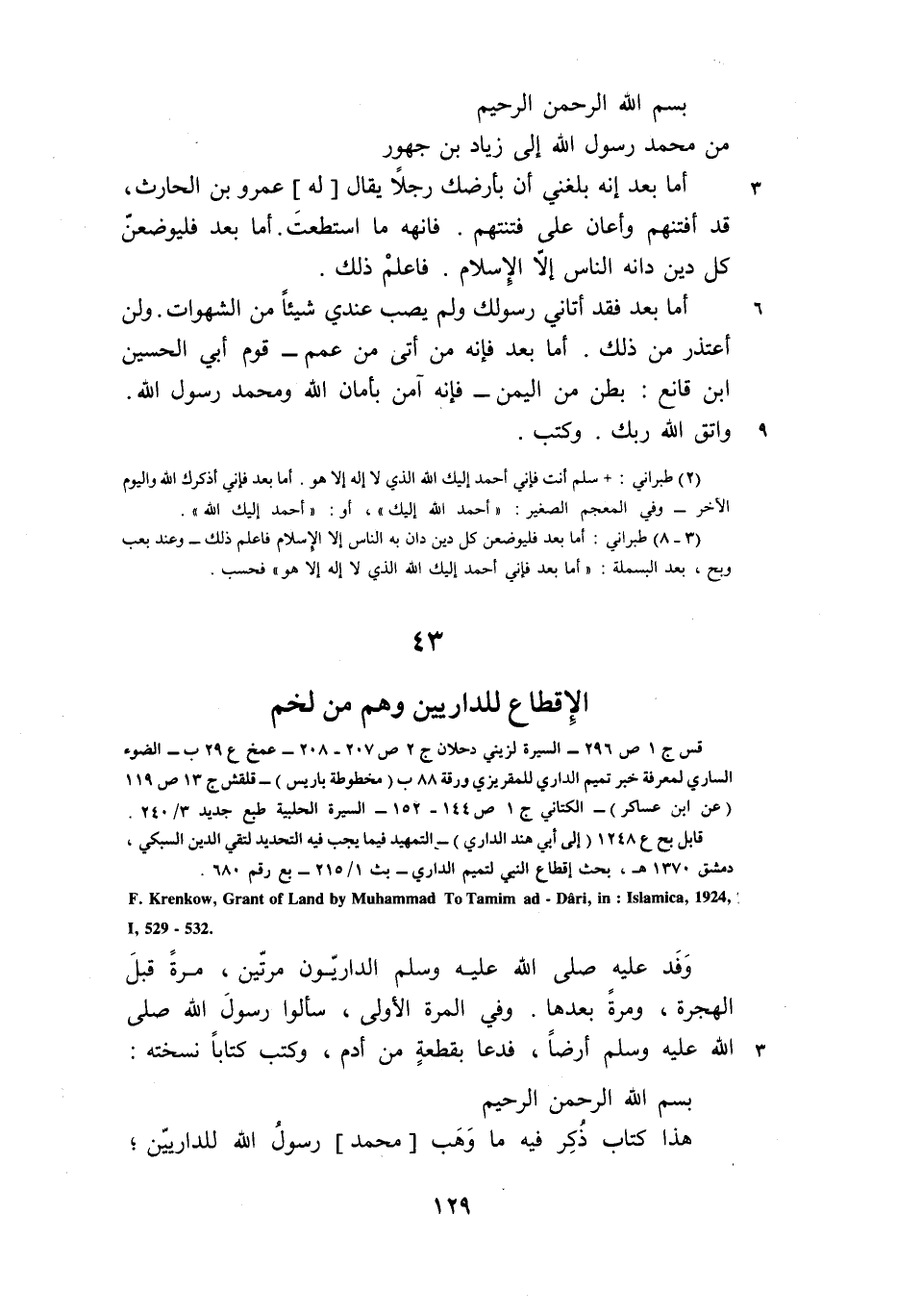 F.Krenkow, Grant of Land by Muhammad To Tamim ad- Dari, in:Islamica, 1924,