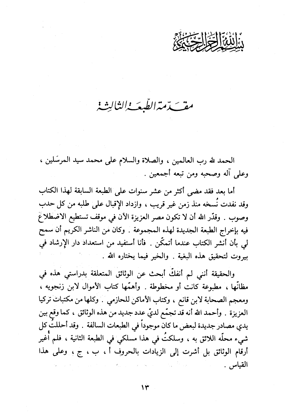 والحقيقة أنني لم أنفكّ أبحث عن الوثائق المتعلقة بدراستي هذه في مظانّها، مطبوعة كانت أو مخطوطة. وأهمّها كتاب الأموال لابن زنجويه، ومعجم الصحابة لابن قانع، وكتاب الأماكن للحازمي. وكلها من مكتبات تركيا العزيزة. وأحمد الله أنه قد تجمّع لديّ عدد جديد من هذه الوثائق، كما وقع بين يدي مصادر جديدة لبعض ما كان موجودا في الطبعات السالفة. وقد أحللت كل شيء محلّه اللائق به، وسلكت في هذا مسلكي في الطبعة الثانية، فلم أغير أرقام الوثائق بل أشرت إلى الزيادات بالحروف أ، ب، ج، وعلى هذا القياس.