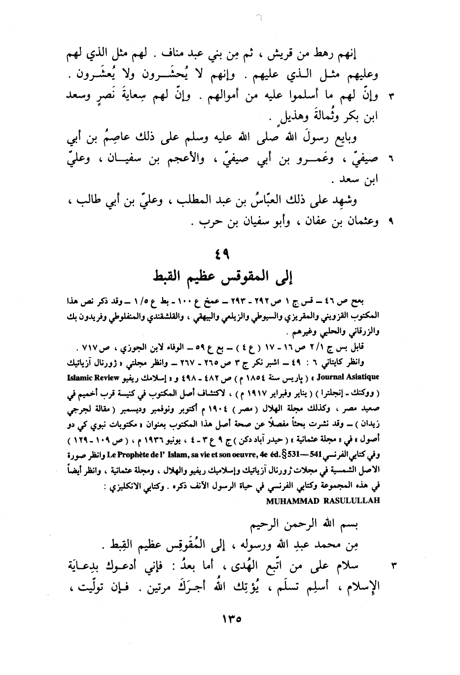 وانظر كايتاني 6: 49- اشبر نكر ج 3 ص 265- 267- وانظر مجلتي «ژورنال آزياتيكپ) JournalA siatique «اريس سنة 1854 م) ص 482- 498 و «إسلامك ريفيو) IslamicR eview ووكنك- إنجلترا) (يناير وفبراير 1917 م) ، لاكتشاف أصل المكتوب في كنيسة قرب أخميم في صعيد مصر، وكذلك مجلة الهلال (مصر) 1904 م أكتوبر ونوفمبر وديسمبر (مقالة لجرجي زيدان) - وقد نشرت بحثا مفصلا عن صحة أصل هذا المكتوب بعنوان «مكتوبات نبوي كي دو أصول» في «مجلة عثمانية» (حيدر آباد دكن) ج 9 ع 3- 4، يونيو 1936 م، (ص 109- 129) وفي كتابي الفرنسي 145 -135.Le Prophete de l ,Islam ,sa vie et son oeuvre ,4 eed وانظر صورة الاصل الشمسية في مجلات ژورنال آزياتيك وإسلاميك ريفيو والهلال، ومجلة عثمانية، وانظر أيضا في هذه المجموعة وكتابي الفرنسي في حياة الرسول الآنف ذكره. وكتابي الانكليزي: