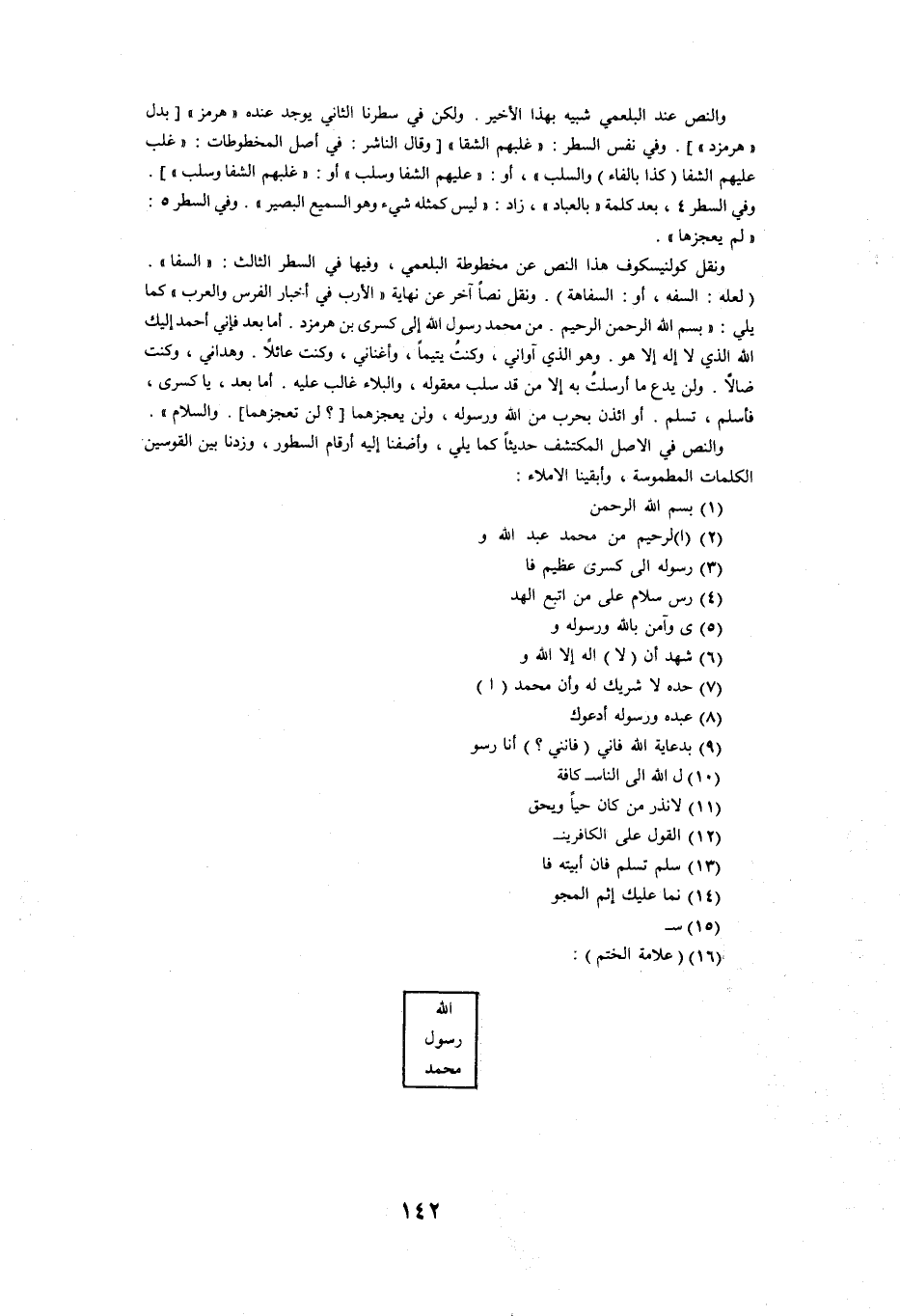 (لعله: السفه، أو: السفاهة) . ونقل نصا آخر عن نهاية «الأرب في أخبار الفرس والعرب» كما يلي: «بسم الله الرحمن الرحيم. من محمد رسول الله إلى كسرى بن هرمزد. أما بعد فإني أحمد إليك الله الذي لا إله إلا هو. وهو الذي آواني، وكنت يتيما، وأغناني، وكنت عائلا. وهداني، وكنت ضالا. ولن يدع ما أرسلت به إلا من قد سلب معقوله، والبلاء غالب عليه. أما بعد، يا كسرى، فأسلم، تسلم. أو ائذن بحرب من الله ورسوله، ولن يعجزهما [؟ لن تعجزهما] . والسلام» .