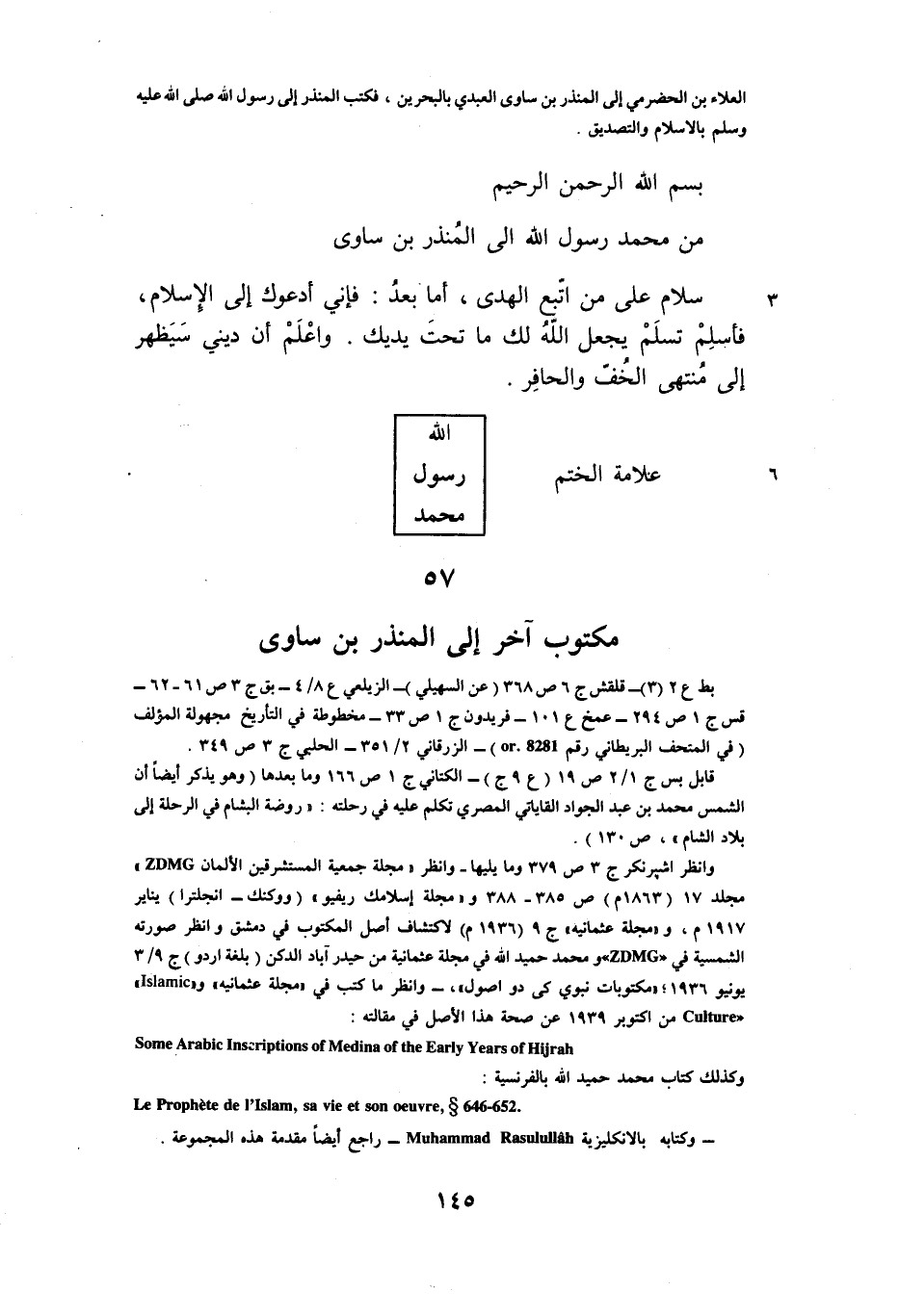 وانظر اشپرنكر ج 3 ص 379 وما يليها- وانظر «مجلة جمعية المستشرقين الألمان «ZDMG مجلد 17 (1863 م) ص 385- 388 و «مجلة إسلامك ريفيو» (ووكنك- انجلترا) يناير 1917 م، و «مجلة عثمانيه» ج 9 (1936 م) لاكتشاف أصل المكتوب في دمشق وانظر صورته الشمسية فيZ ZDMG z ومحمد حميد الله في مجلة عثمانية من حيدر آباد الدكن (بلغة اردو) ج 9/ 3 يونيو 1936؛ «مكتوبات نبوي كى دو اصول» ، - وانظر ما كتب في «مجلة عثمانيه» و Islamic zZ Culture» من اكتوبر 1939 عن صحة هذا الأصل في مقالته: