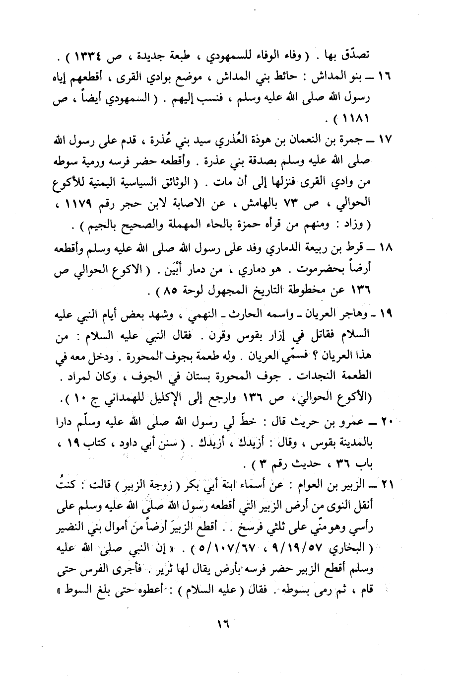 21- الزبير بن العوام: عن أسماء ابنة أبي بكر (زوجة الزبير) قالت: كنت أنقل النوى من أرض الزبير التي أقطعه رسول الله صلى الله عليه وسلم على رأسي وهو منّي على ثلثي فرسخ ... أقطع الزبير أرضا من أموال بني النضير (البخاري 57/ 19/ 9، 67/ 107/ 5) . «إن النبي صلى الله عليه وسلم أقطع الزبير حضر فرسه بأرض يقال لها ثرير. فأجرى الفرس حتى قام، ثم رمى بسوطه. فقال (عليه السلام) : أعطوه حتى بلغ السوط»