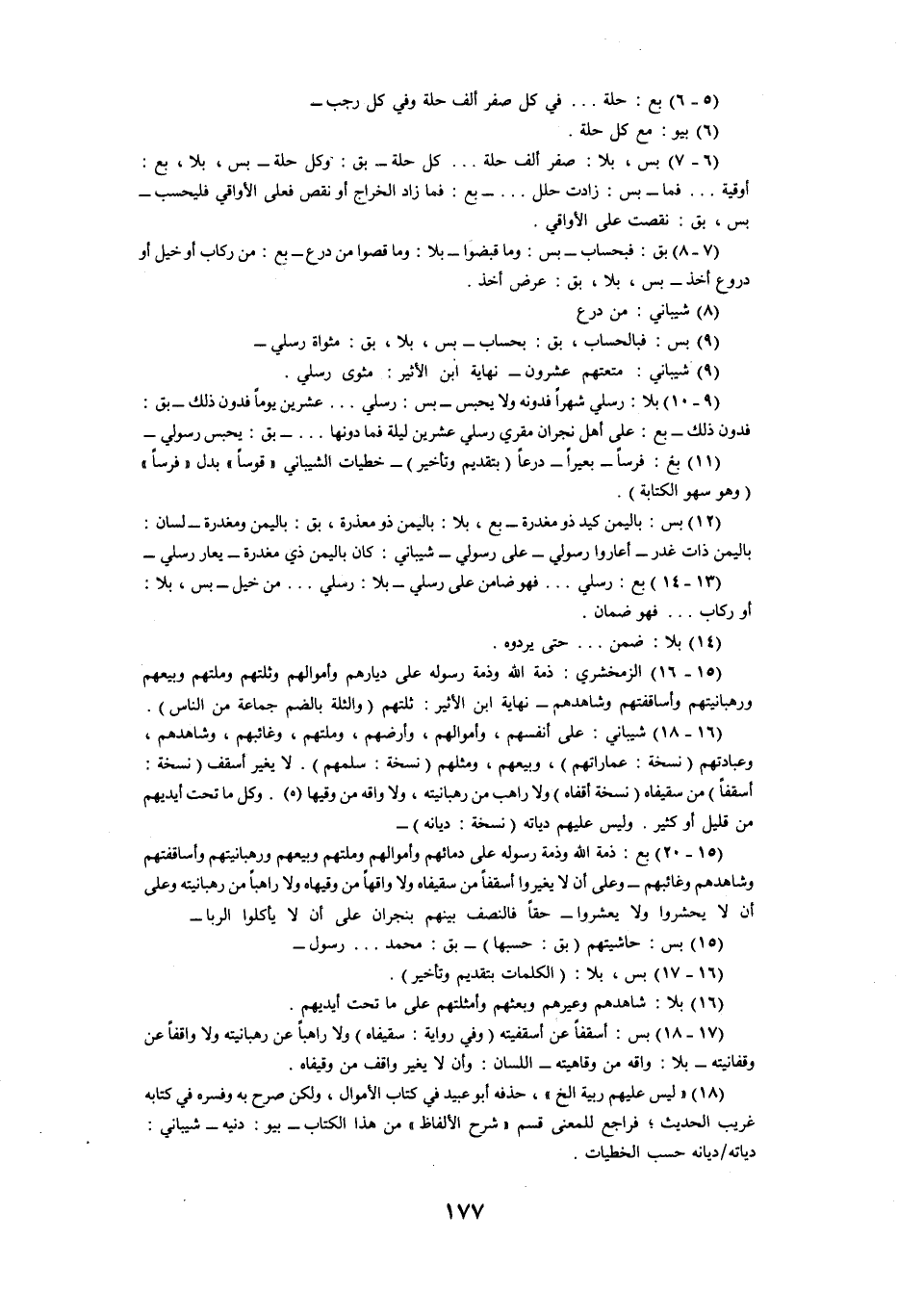 (15- 20) بع: ذمة الله وذمة رسوله على دمائهم وأموالهم وملتهم وبيعهم ورهبانيتهم وأساقفتهم وشاهدهم وغائبهم- وعلى أن لا يغيروا أسقفا من سقيفاه ولا واقها من وقيهاه ولا راهبا من رهبانيته وعلى أن لا يحشروا ولا يعشروا- حقا فالنصف بينهم بنجران على أن لا يأكلوا الربا-