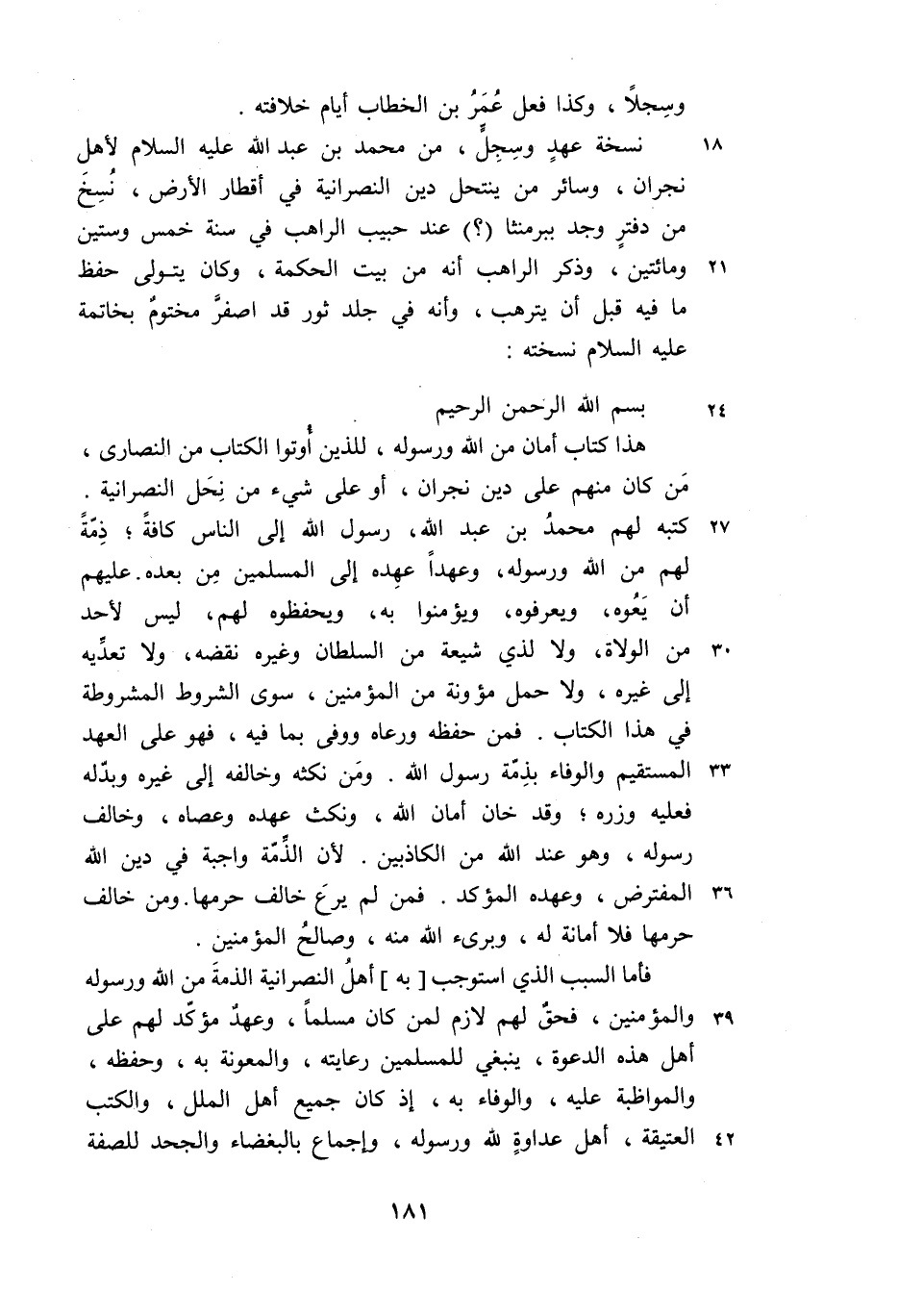 نسخة عهد وسجلّ، من محمد بن عبد الله عليه السلام لأهل نجران، وسائر من ينتحل دين النصرانية في أقطار الأرض، نسخ من دفتر وجد ببرمنثا (؟) عند حبيب الراهب في سنة خمس وستين ومائتين، وذكر الراهب أنه من بيت الحكمة، وكان يتولى حفظ ما فيه قبل أن يترهب، وأنه في جلد ثور قد اصفرّ مختوم بخاتمة عليه السلام نسخته:
