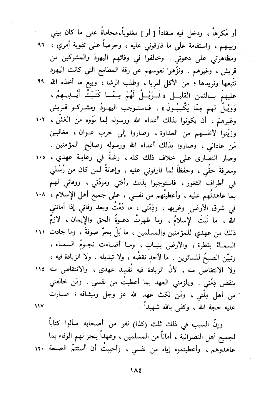 وصار النصارى على خلاف ذلك كله، رغبة في رعاية عهدي، ومعرفة حقّي، وحفظا لما فارقوني عليه، وإعانة لمن كان من رسلي في أطراف الثغور، فاستوجبوا بذلك رأفتي ومودّتي، ووفائي لهم بما عاهدتهم عليه، وأعطيتهم من نفسي، على جميع أهل الإسلام، في شرق الأرض وغربها، وذمّتي، ما دمت وبعد وفاتي إذا أماتني الله، ما نبت الإسلام، وما ظهرت دعوة الحق والإيمان، لازم ذلك من عهدي للمؤمنين والمسلمين، ما بلّ بحر صوفة، وما جادت السماء بقطرة، والأرض بنبات، وما أضاءت نجوم السماء، وتبيّن الصبح للسائرين. ما لأحد نقضه، ولا تبديله، ولا الزيادة فيه، ولا الانتقاص منه، لأنّ الزيادة فيه تفسد عهدي، والانتقاص منه ينقض ذمّتي. ويلزمني العهد بما أعطيت من نفسي. ومن خالفني من أهل ملّتي، ومن نكث عهد الله عز وجل وميثاقه؛ صارت عليه حجة الله، وكفى بالله شهيدا.