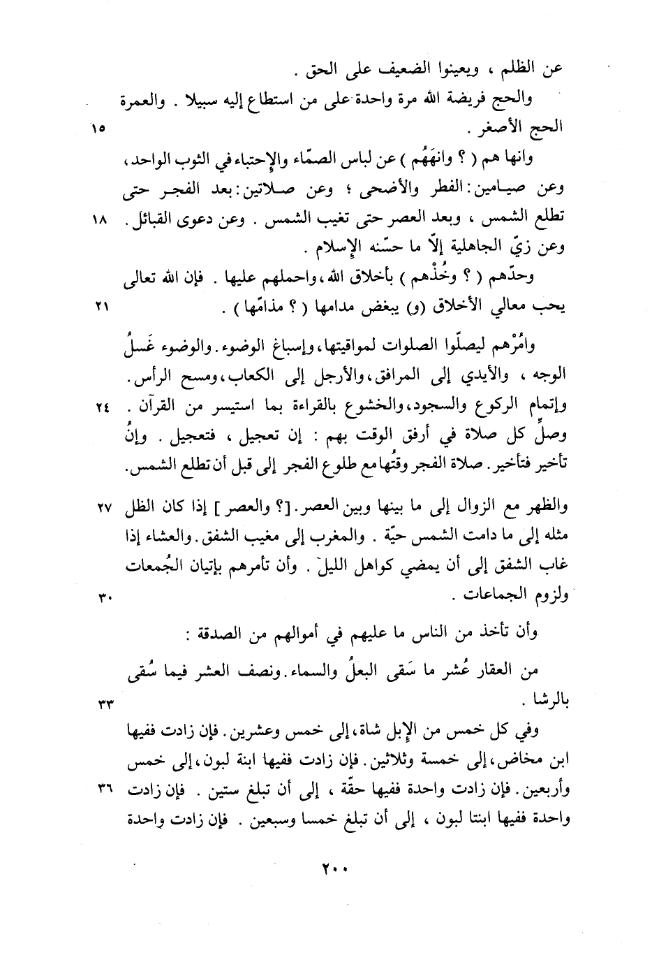 وانهاهم (؟ وانههم) عن لباس الصمّاء والإحتباء في الثوب الواحد، وعن صيامين: الفطر والأضحى؛ وعن صلاتين: بعد الفجر حتى تطلع الشمس، وبعد العصر حتى تغيب الشمس. وعن دعوى القبائل.