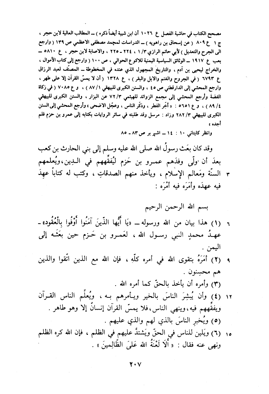 مصحح الكتاب في حاشية الفصل ع 1026 أن ابن شيبة أيضا ذكره) - المطالب العالية لابن حجر، ج 1 ع 809 (عن إسحاق بن راهويه) - الدراسات لمحمد مصطفى الاعظمي ص 139 (وارجع الى الجرح والتعديل) لأبي حاتم الرازي 3/ 1، 224- 225، والاصابة لابن حجر، ع 5810- بعب ع 1917- الوثائق السياسية اليمنية للاكوع الحوالي، ص 100 (وارجع إلى كتاب الأموال، والخراج ليحيى بن آدم، والتاريخ المجهول الذي عنده في المخطوطة- المصنّف لعبد الرزاق ع 6793 (في الجروح والغنم والابل والبقر) ، ع 1328 (أن لا يمسّ القرآن إلا على طهر، وارجع المحشي إلى الدارقطني ص 45، والسنن الكبرى للبيهقي 1/ 87) ، وع 7085 (في زكاة الفضة وأرجع المحشي إلى مجمع الزوائد للهيثمي 3/ 72 عن البزار، والسنن الكبرى للبيهقي 4/ 89) ، وع 5651: «أخّر الفطر، وذكّر الناس، وعجّل الاضحى» وأرجع المحشي إلى السنن الكبرى للبيهقي 3/ 282 وزاد: مرسل وقد طلبته في سائر الروايات بكتابه إلى عمرو بن حزم فلم أجده»