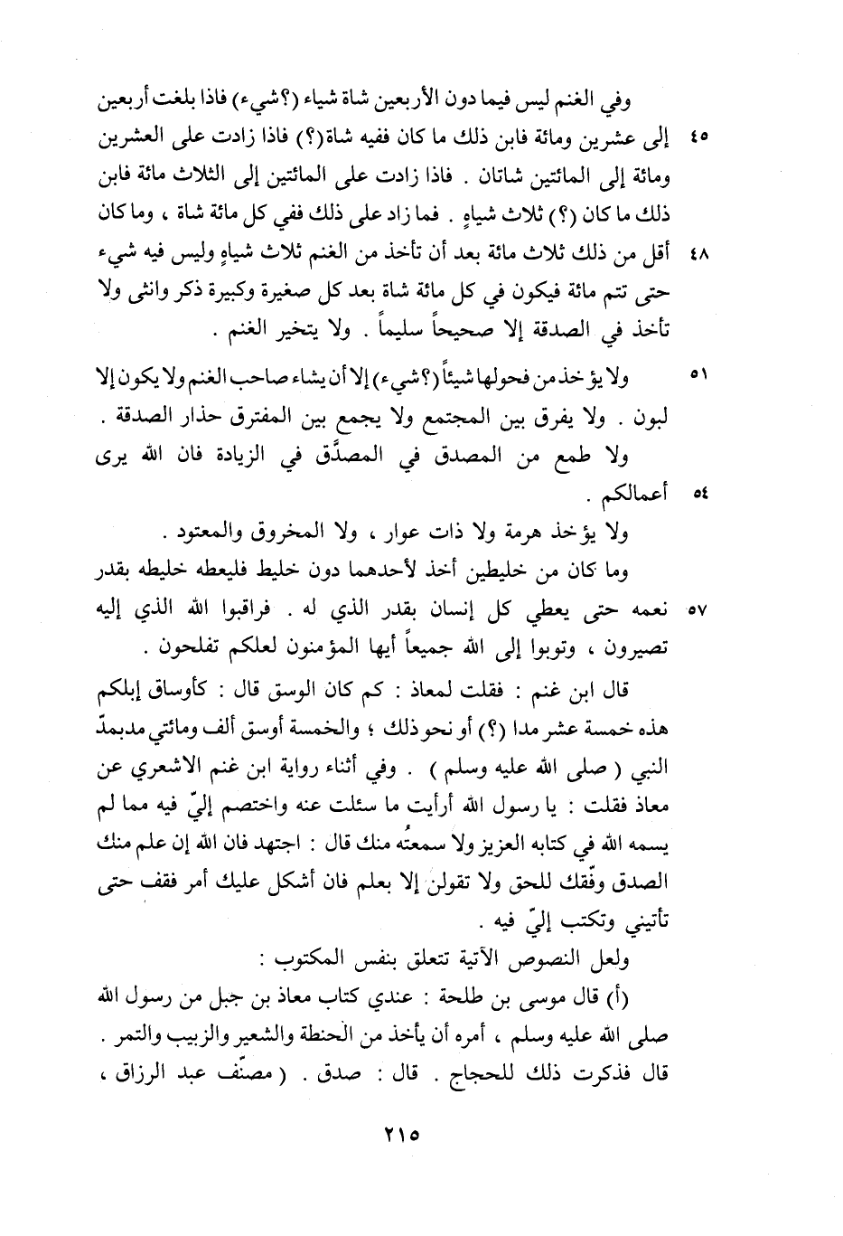قال ابن غنم: فقلت لمعاذ: كم كان الوسق قال: كأوساق إبلكم هذه خمسة عشر مدا (؟) أو نحو ذلك؛ والخمسة أوسق ألف ومائتي مد بمدّ النبي (صلى الله عليه وسلم) . وفي أثناء رواية ابن غنم الاشعري عن معاذ فقلت: يا رسول الله أرأيت ما سئلت عنه واختصم إليّ فيه مما لم يسمه الله في كتابه العزيز ولا سمعته منك قال: اجتهد فان الله إن علم منك الصدق وفّقك للحق ولا تقولن إلا بعلم فان أشكل عليك أمر فقف حتى تأتيني وتكتب إليّ فيه.