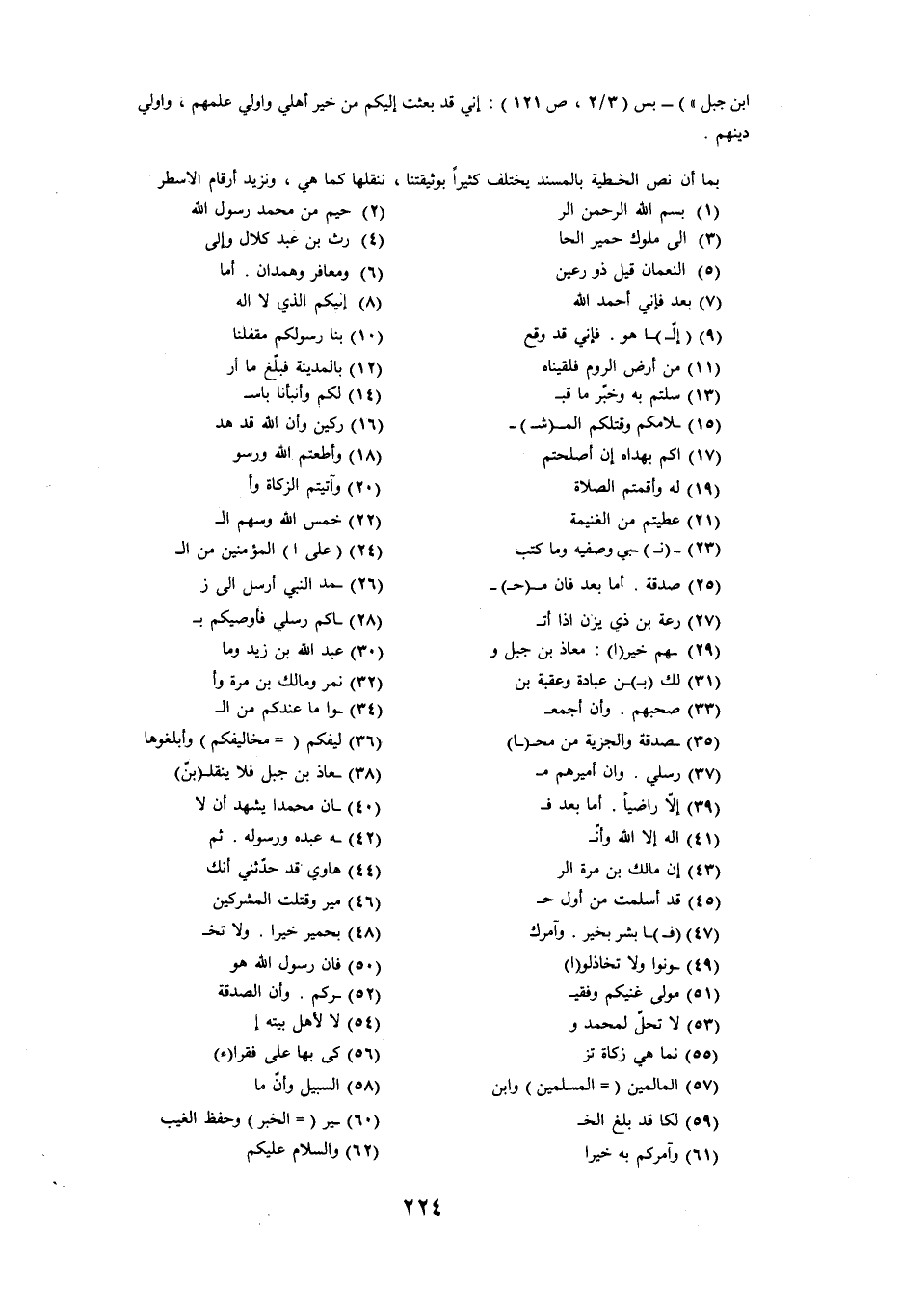 بما أن نص الخطية بالمسند يختلف كثيرا بوثيقتنا، ننقلها كما هي، ونزيد أرقام الاسطر: