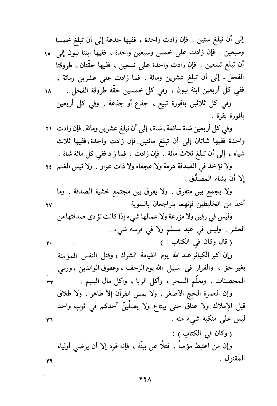 (قال وكان في الكتاب:) وإن أكبر الكبائر عند الله يوم القيامة الشرك، وقتل النفس المؤمنة بغير حق، والفرار في سبيل الله يوم الزحف، وعقوق الوالدين، ورمي المحصنات، وتعلّم السحر، وأكل الربا، وأكل مال اليتيم.