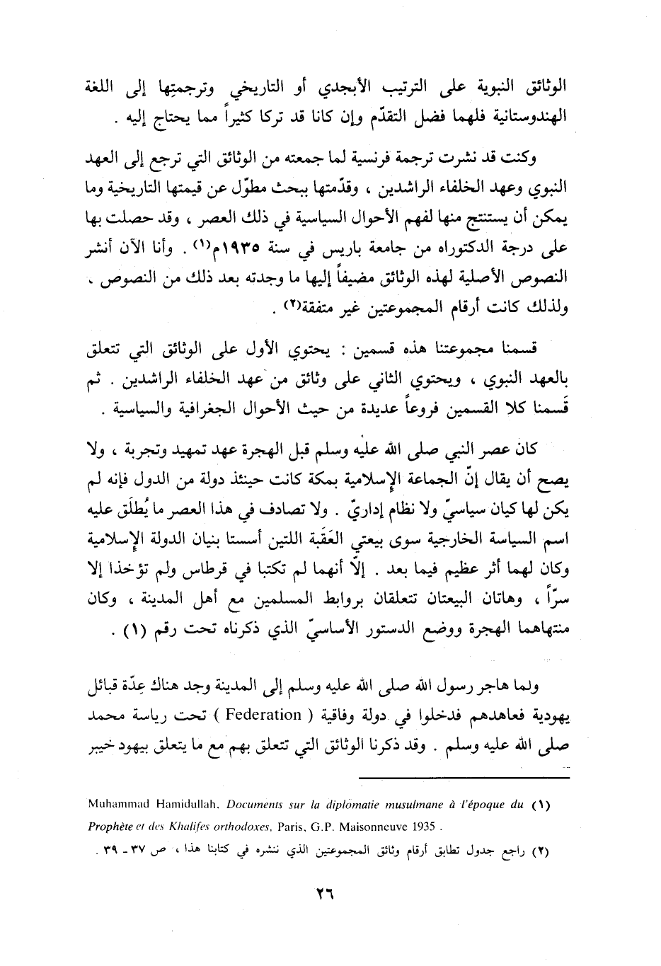 وكنت قد نشرت ترجمة فرنسية لما جمعته من الوثائق التي ترجع إلى العهد النبوي وعهد الخلفاء الراشدين، وقدّمتها ببحث مطوّل عن قيمتها التاريخية وما يمكن أن يستنتج منها لفهم الأحوال السياسية في ذلك العصر، وقد حصلت بها على درجة الدكتوراه من جامعة باريس في سنة 1935 م «1» . وأنا الآن أنشر النصوص الأصلية لهذه الوثائق مضيفا إليها ما وجدته بعد ذلك من النصوص، ولذلك كانت أرقام المجموعتين غير متفقة «2» .