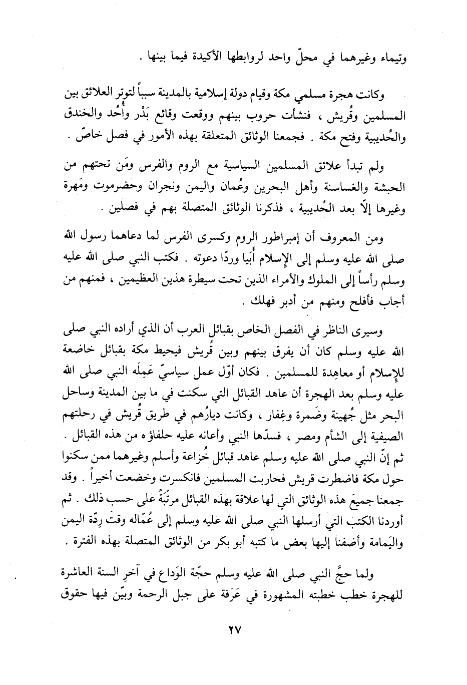 ثم إنّ النبي صلى الله عليه وسلم عاهد قبائل خزاعة وأسلم وغيرهما ممن سكنوا حول مكة فاضطرت قريش فحاربت المسلمين فانكسرت وخضعت أخيرا. وقد جمعنا جميع هذه الوثائق التي لها علاقة بهذه القبائل مرتّبة على حسب ذلك. ثم أوردنا الكتب التي أرسلها النبي صلى الله عليه وسلم إلى عمّاله وقت ردّة اليمن واليمامة وأضفنا إليها بعض ما كتبه أبو بكر من الوثائق المتصلة بهذه الفترة.