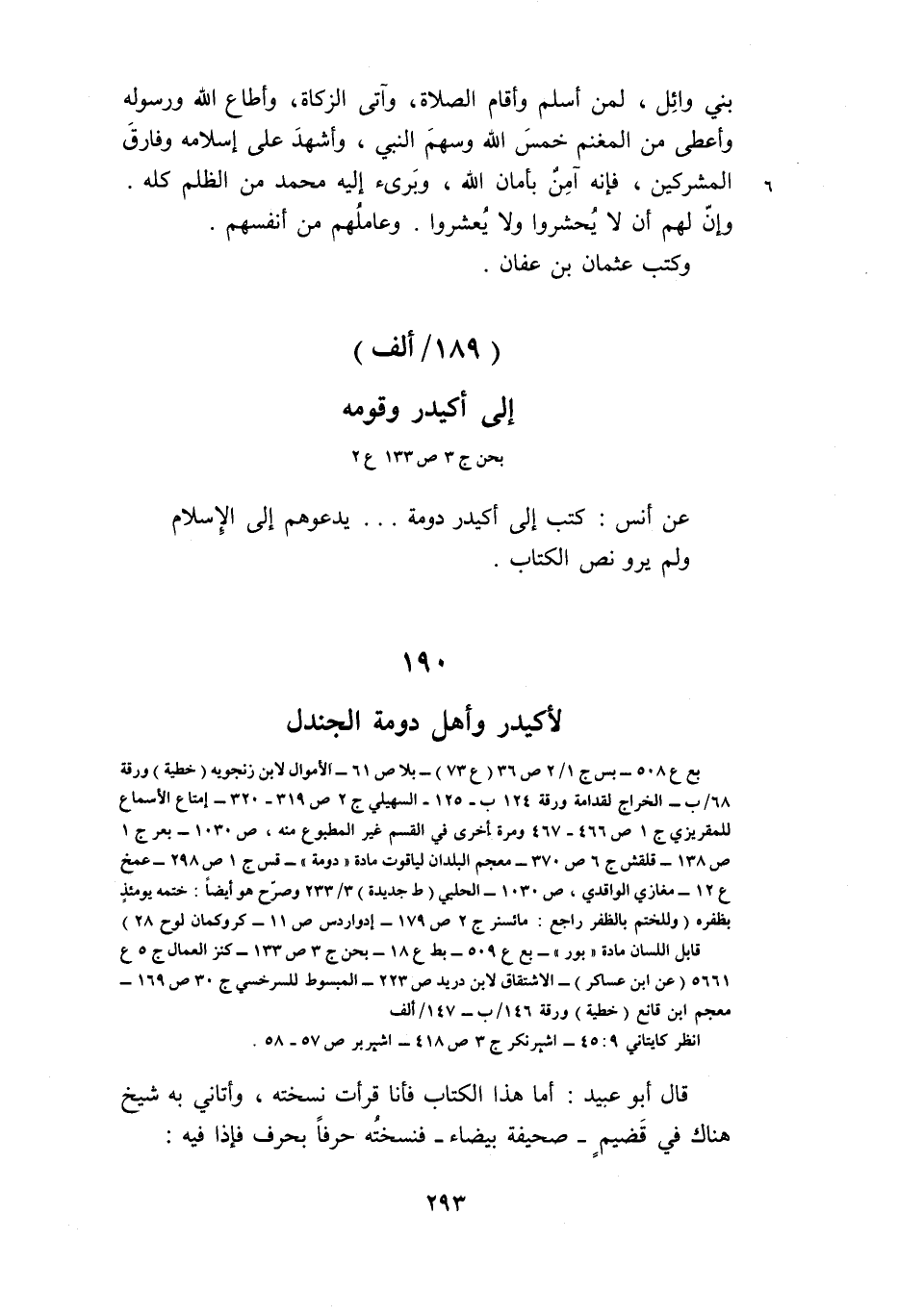 بع ع 508- بس ج 1/ 2 ص 36 (ع 73) - بلا ص 61- الأموال لابن زنجويه (خطية) ورقة 68/ ب- الخراج لقدامة ورقة 124 ب- 125- السهيلي ج 2 ص 319- 320- إمتاع الأسماع للمقريزي ج 1 ص 466- 467 ومرة أخرى في القسم غير المطبوع منه، ص 1030- بعر ج 1 ص 138- قلقش ج 6 ص 370- معجم البلدان لياقوت مادة «دومة» - قس ج 1 ص 298- عمخ ع 12- مغازي الواقدي، ص 1030- الحلبي (ط جديدة) 3/ 233 وصرّح هو أيضا: ختمه يومئذ بظفره (وللختم بالظفر راجع: مائسنر ج 2 ص 179- إدواردس ص 11- كروكمان لوح 28)