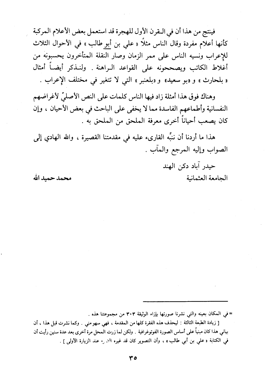 فينتج من هذا أن في القرن الأول للهجرة قد استعمل بعض الأعلام المركبة كأنها أعلام مفردة وقال الناس مثلا «علي بن أبو طالب» في الأحوال الثلاث للإعراب ونسيه الناس على ممر الزمان وصار النقلة المتأخرون يحسبونه من أغلاط الكاتب ويصححونه على القواعد الراهنة. ولنذكر أيضا أمثال «بلحارث» و «بو سعيد» و «بلعنبر» التي لا تتغير في مختلف الإعراب.