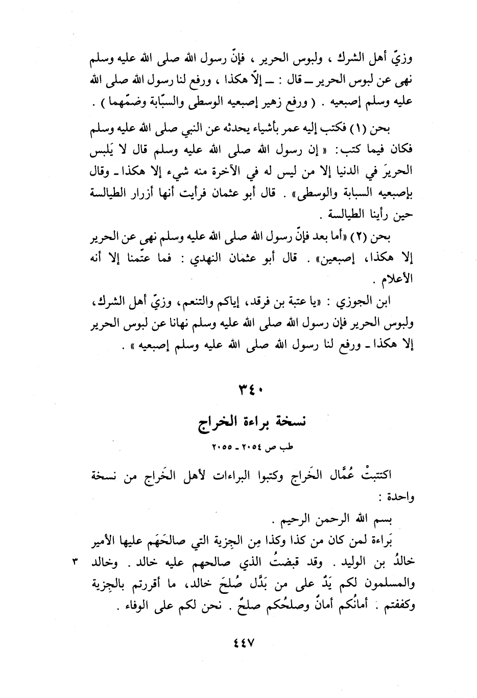 بحن (1) فكتب إليه عمر بأشياء يحدثه عن النبي صلى الله عليه وسلم فكان فيما كتب: «إن رسول الله صلى الله عليه وسلم قال لا يلبس الحرير في الدنيا إلا من ليس له في الآخرة منه شيء إلا هكذا- وقال بإصبعيه السبابة والوسطى» . قال أبو عثمان فرأيت أنها أزرار الطيالسة حين رأينا الطيالسة.