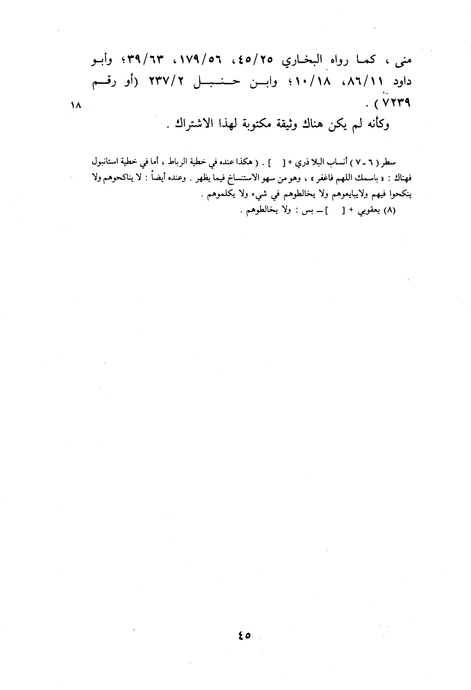 سطر (6- 7) أنساب البلاذري [] . (هكذا عنده في خطية الرباط، أما في خطية استانبول فهناك: «باسمك اللهم فاغفر» ، وهو من سهو الاستنساخ فيما يظهر. وعنده أيضا: لا يناكحوهم ولا ينكحوا فيهم ولا يبايعوهم ولا يخالطوهم في شيء ولا يكلموهم.