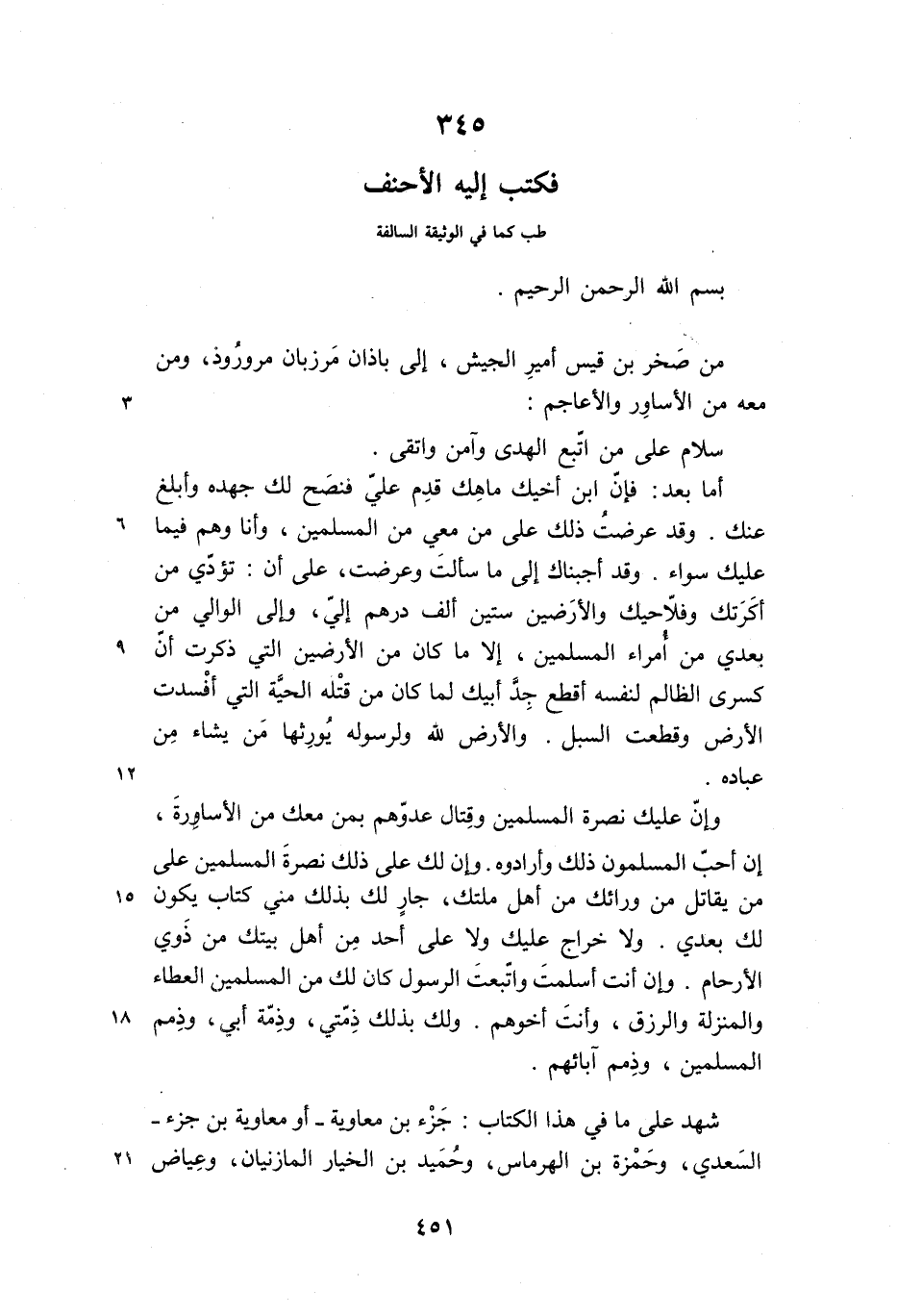 من صخر بن قيس أمير الجيش، إلى باذان مرزبان مروروذ، ومن معه من الأساور والأعاجم: