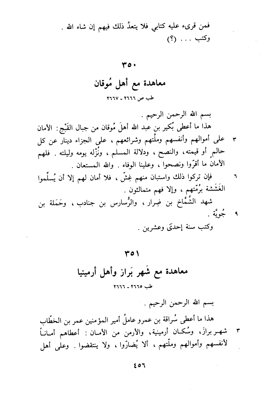 هذا ما أعطى سراقة بن عمرو عامل أمير المؤمنين عمر بن الخطّاب شهر براز، وسكان أرمينية، والأرمن من الأمان: أعطاهم أمانا لأنفسهم وأموالهم وملّتهم، ألا يضارّوا، ولا ينتقضوا. وعلى أهل
