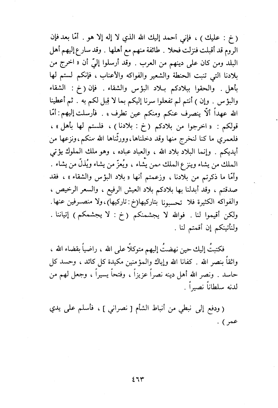 (خ: عليك) ، فإني أحمد إليك الله الذي لا إله إلا هو. أمّا بعد فإن الروم قد أقبلت فنزلت فحلا. طائفة منهم مع أهلها. وقد سارع إليهم أهل البلد ومن كان على دينهم من العرب. وقد أرسلوا إليّ أن «اخرج من بلادنا التي تنبت الحنطة والشعير والفواكه والأعناب، فإنكم لستم لها بأهل. والحقوا ببلادكم بلاد البؤس والشقاء. فإن (خ: الشقاء والبؤس. وإن) أنتم لم تفعلوا سرنا إليكم بما لا قبل لكم به. ثم أعطينا الله عهدا ألّا ينصرف عنكم ومنكم عين تطرف» . فأرسلت إليهم: أمّا قولكم: «اخرجوا من بلادكم (خ: بلادنا) ، فلستم لها بأهل» ، فلعمري ما كنا لنخرج منها وقد دخلناها، وورثّناها الله منكم، ونزعها من أيديكم. وإنما البلاد بلاد الله، والعباد عباده، وهو ملك الملوك يؤتي الملك من يشاء وينزع الملك ممن يشاء، ويعزّ من يشاء ويذلّ من يشاء.