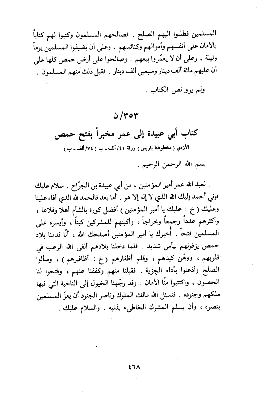 353/ ن كتاب أبي عبيدة إلى عمر مخبرا بفتح حمص