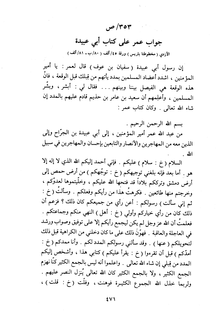 353/ ص جواب عمر على كتاب أبي عبيدة