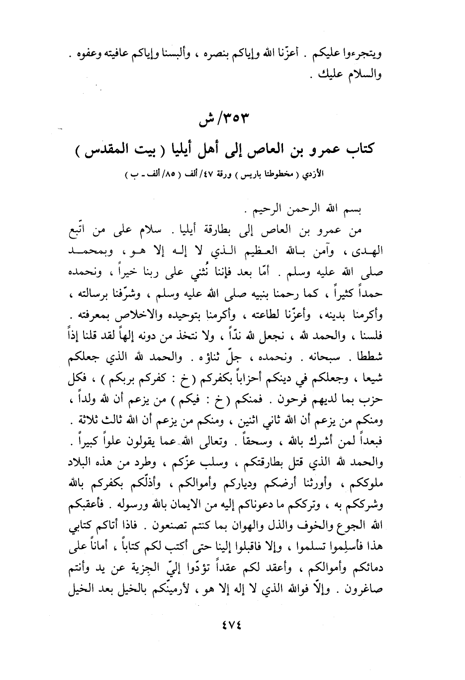 353/ ش كتاب عمرو بن العاص إلى أهل أيليا (بيت المقدس)