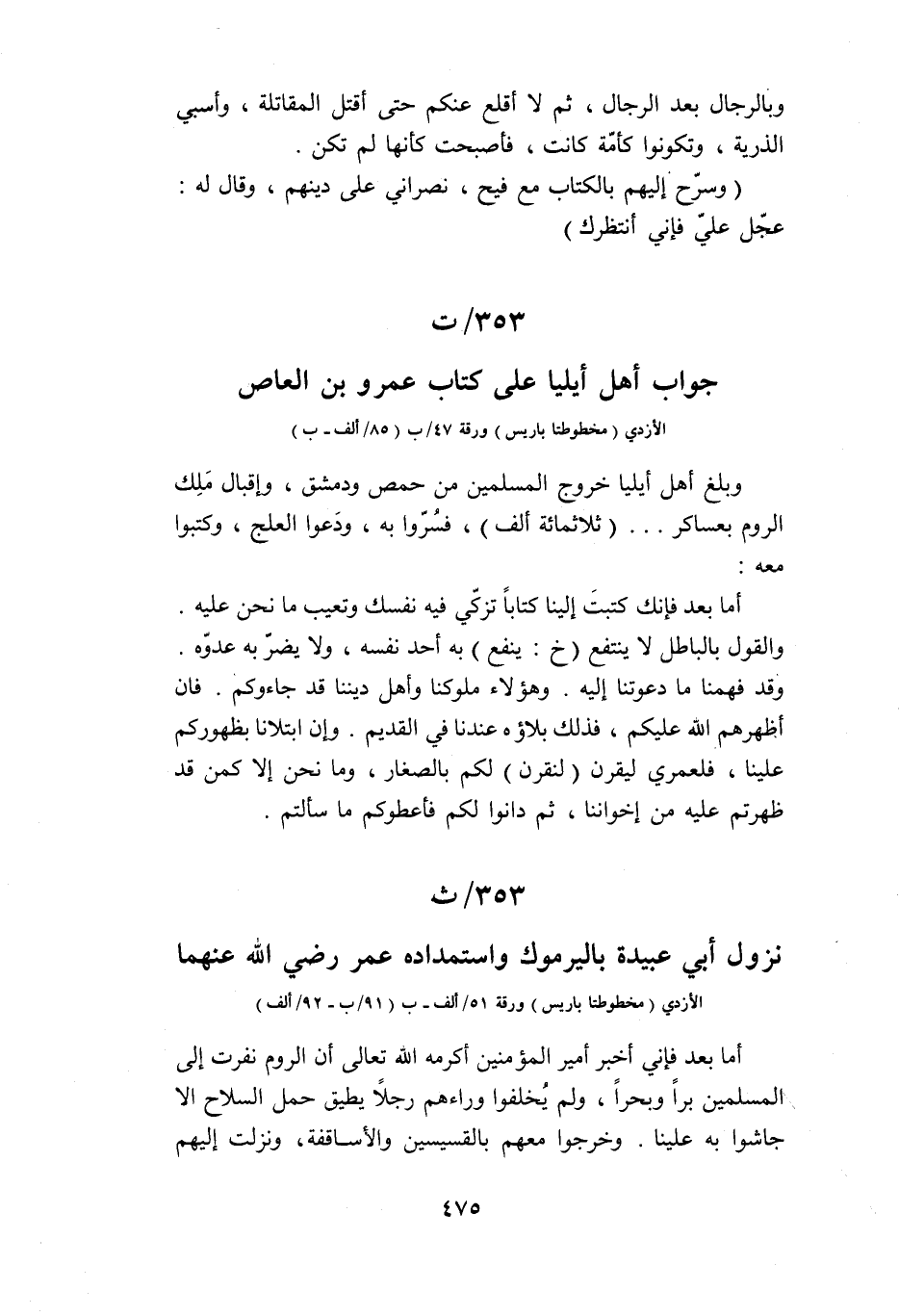 353/ ت جواب أهل أيليا على كتاب عمرو بن العاص