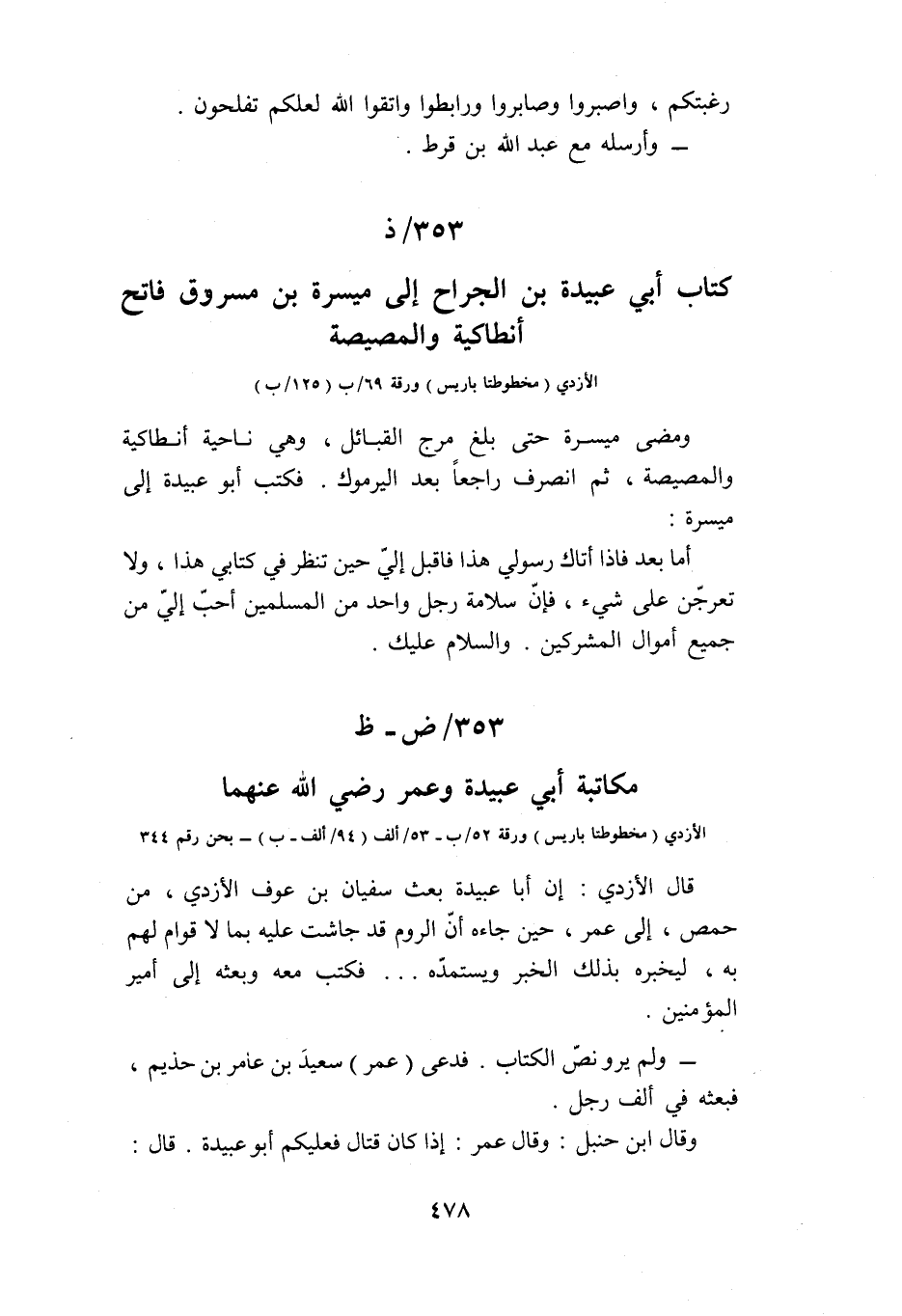 353/ ذ كتاب أبي عبيدة بن الجراح إلى ميسرة بن مسروق فاتح أنطاكية والمصيصة