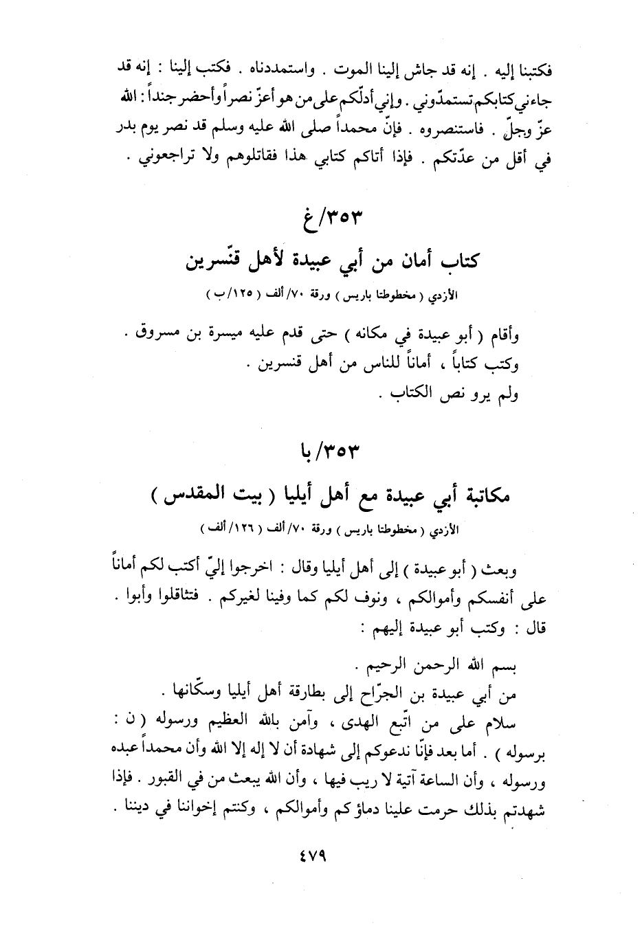 353/ غ كتاب أمان من أبي عبيدة لأهل قنّسرين