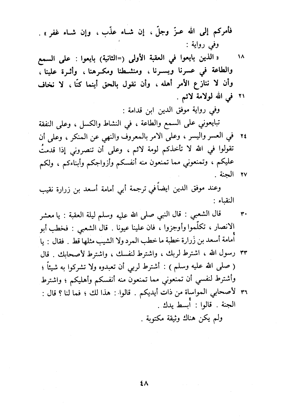 «الذين بايعوا في العقبة الأولى (- الثانية) بايعوا: على السمع والطاعة في عسرنا ويسرنا، ومنشطنا ومكرهنا، وأثرة علينا، وأن لا ننازع الأمر أهله، وأن نقول بالحق أينما كنّا، لا نخاف في الله لولامة لائم.