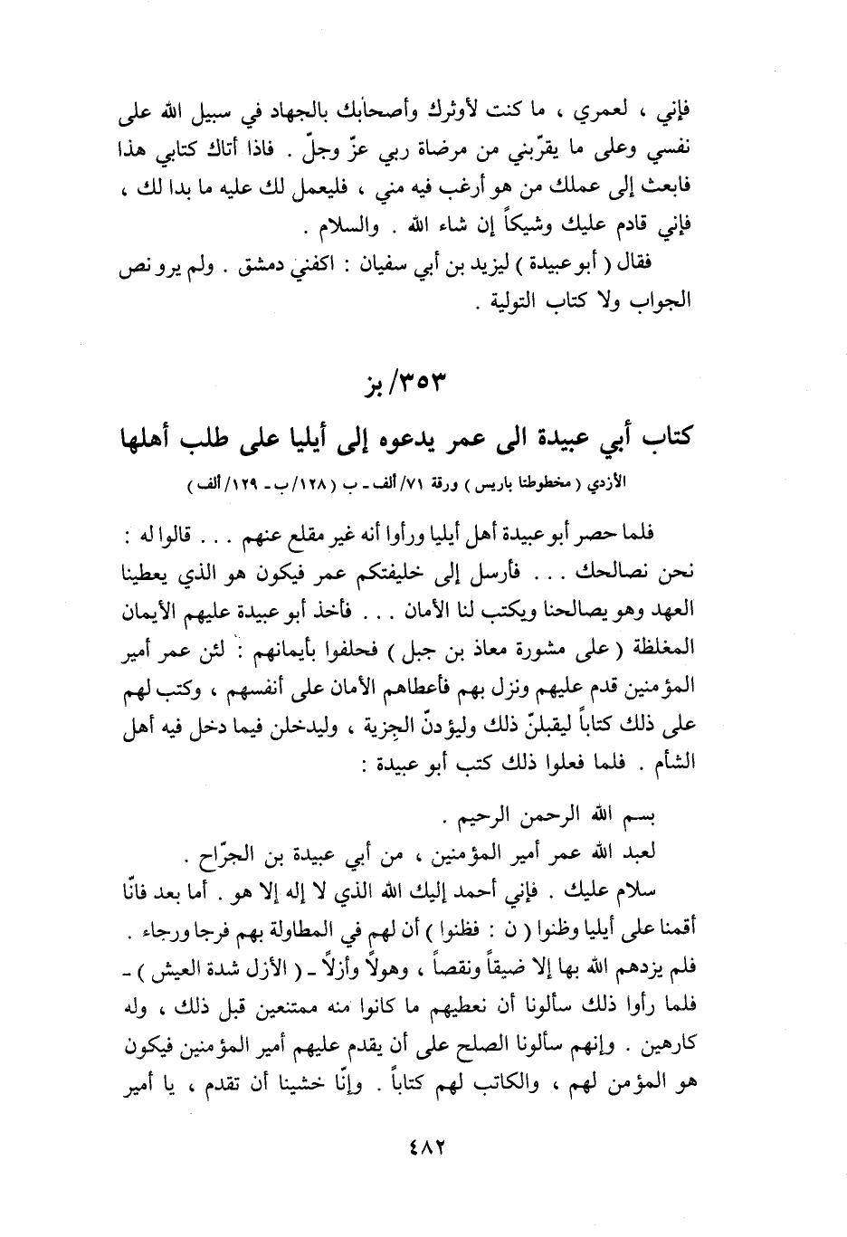 353/ بز كتاب أبي عبيدة الى عمر يدعوه إلى أيليا على طلب أهلها