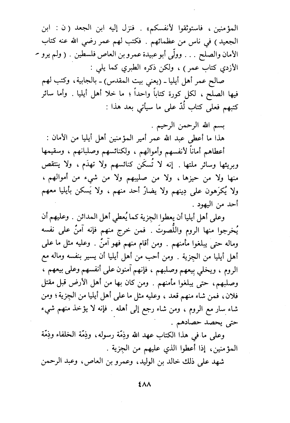 المؤمنين، فاستوثقوا لأنفسكم» . فنزل إليه ابن الجعد (ن: ابن الجعيد) في ناس من عظمائهم. فكتب لهم عمر رضي الله عنه كتاب الأمان والصلح ... وولّى أبو عبيدة عمرو بن العاص فلسطين. (ولم يرو الأزدي كتاب عمر) ، ولكن ذكره الطبري كما يلي: