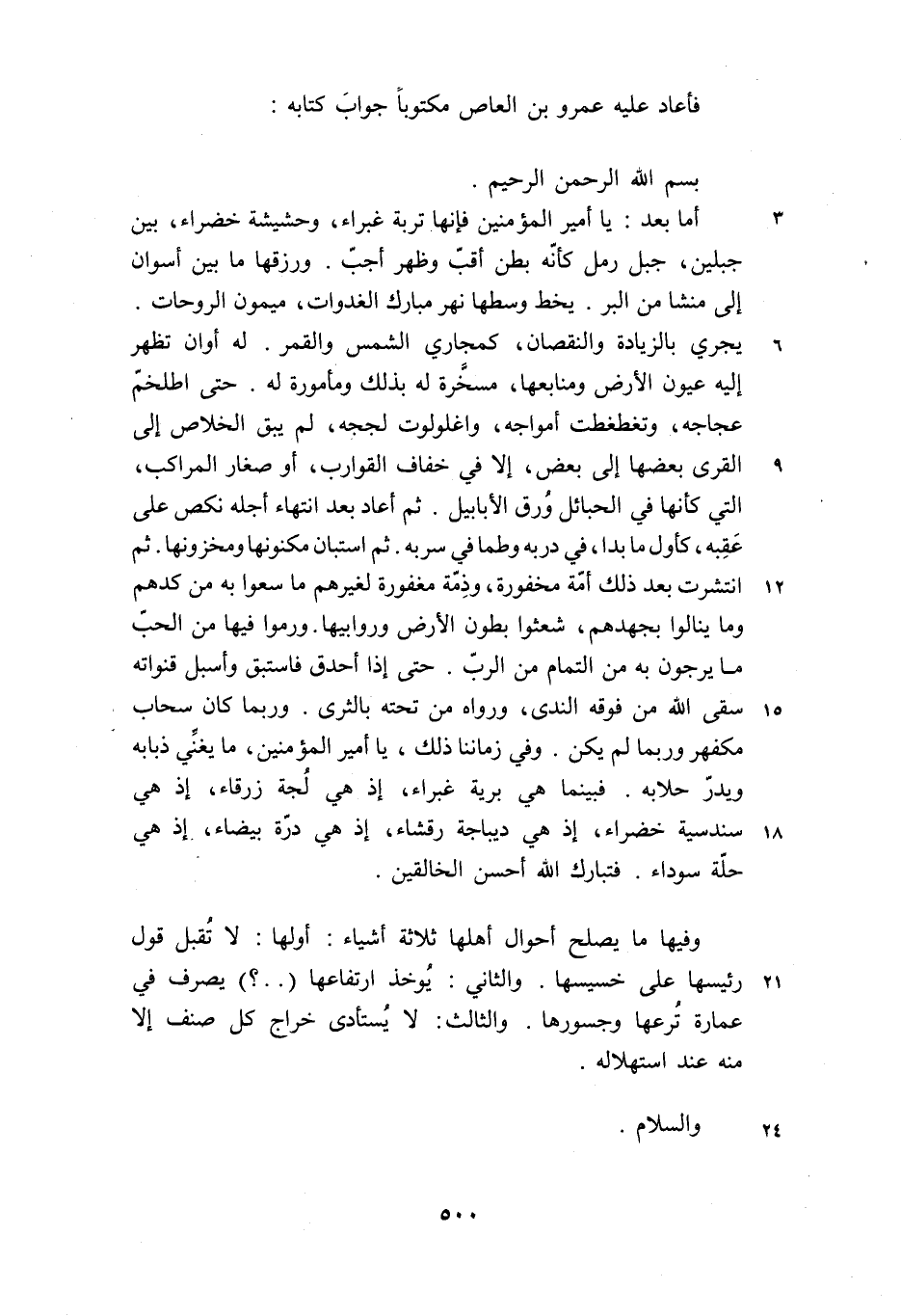 أما بعد: يا أمير المؤمنين فإنها تربة غبراء، وحشيشة خضراء، بين جبلين، جبل رمل كأنّه بطن أقبّ وظهر أجبّ. ورزقها ما بين أسوان إلى منشا من البر. يخط وسطها نهر مبارك الغدوات، ميمون الروحات.