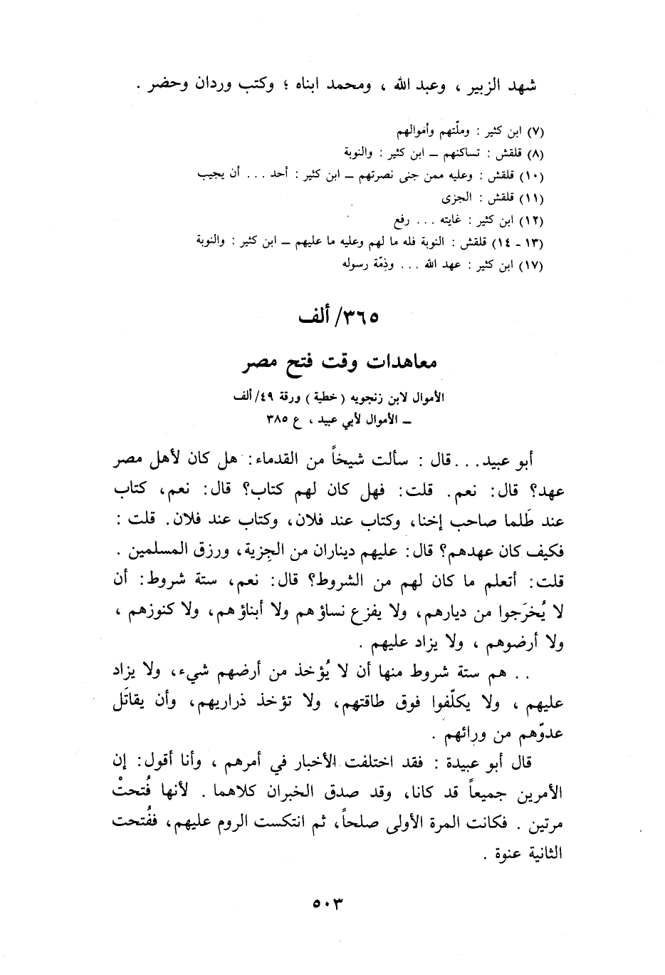أبو عبيد ... قال: سألت شيخا من القدماء: هل كان لأهل مصر عهد؟ قال: نعم. قلت: فهل كان لهم كتاب؟ قال: نعم، كتاب عند طلما صاحب إخنا، وكتاب عند فلان، وكتاب عند فلان. قلت: