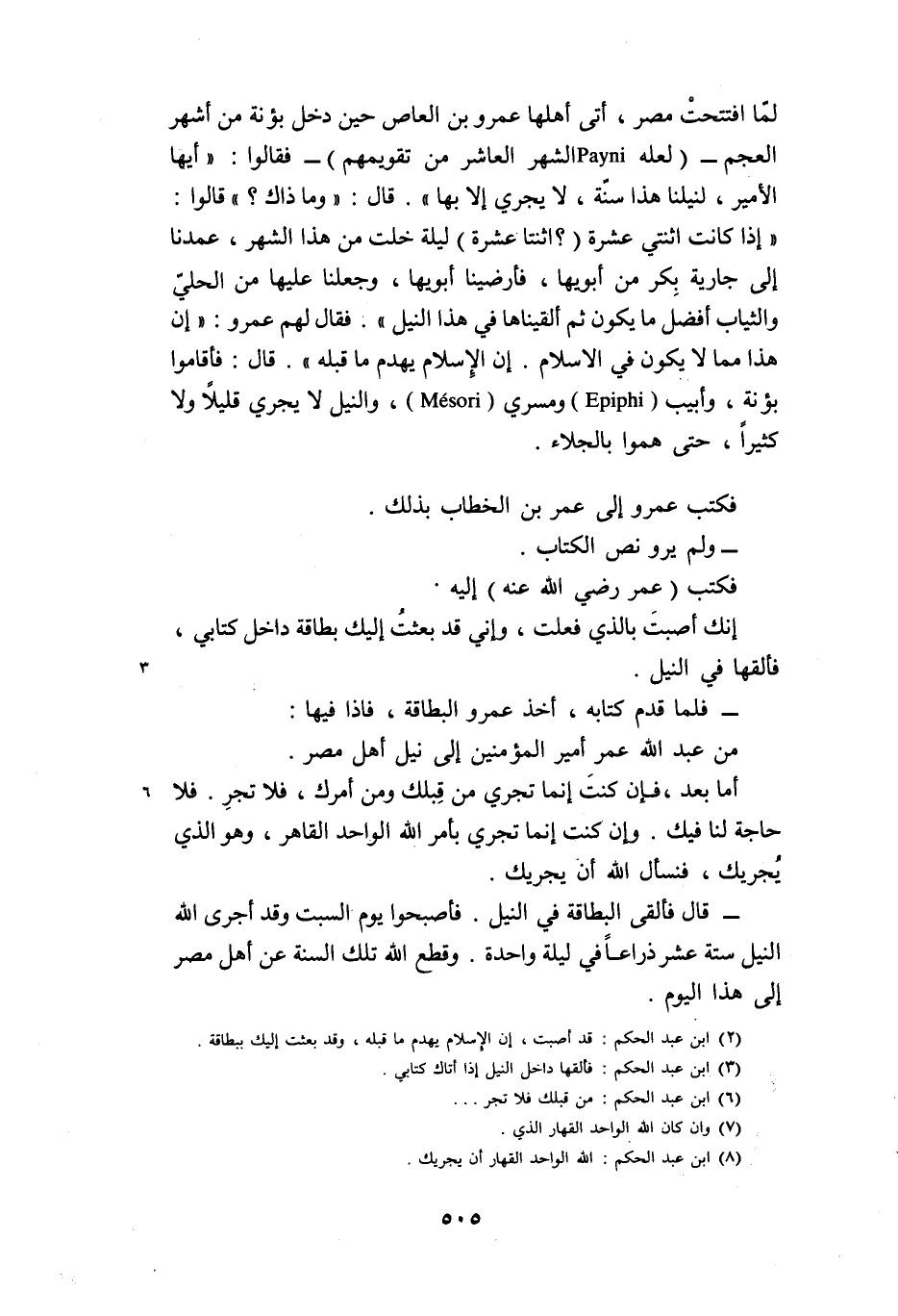 «إذا كانت اثنتي عشرة (؟ اثنتا عشرة) ليلة خلت من هذا الشهر، عمدنا إلى جارية بكر من أبويها، فأرضينا أبويها، وجعلنا عليها من الحليّ والثياب أفضل ما يكون ثم ألقيناها في هذا النيل» . فقال لهم عمرو: «إن هذا مما لا يكون في الاسلام. إن الإسلام يهدم ما قبله» . قال: فأقاموا بؤنة، وأبيب، (Epiphi) (Mesori) والنيل لا يجري قليلا ولا كثيرا، حتى هموا بالجلاء.