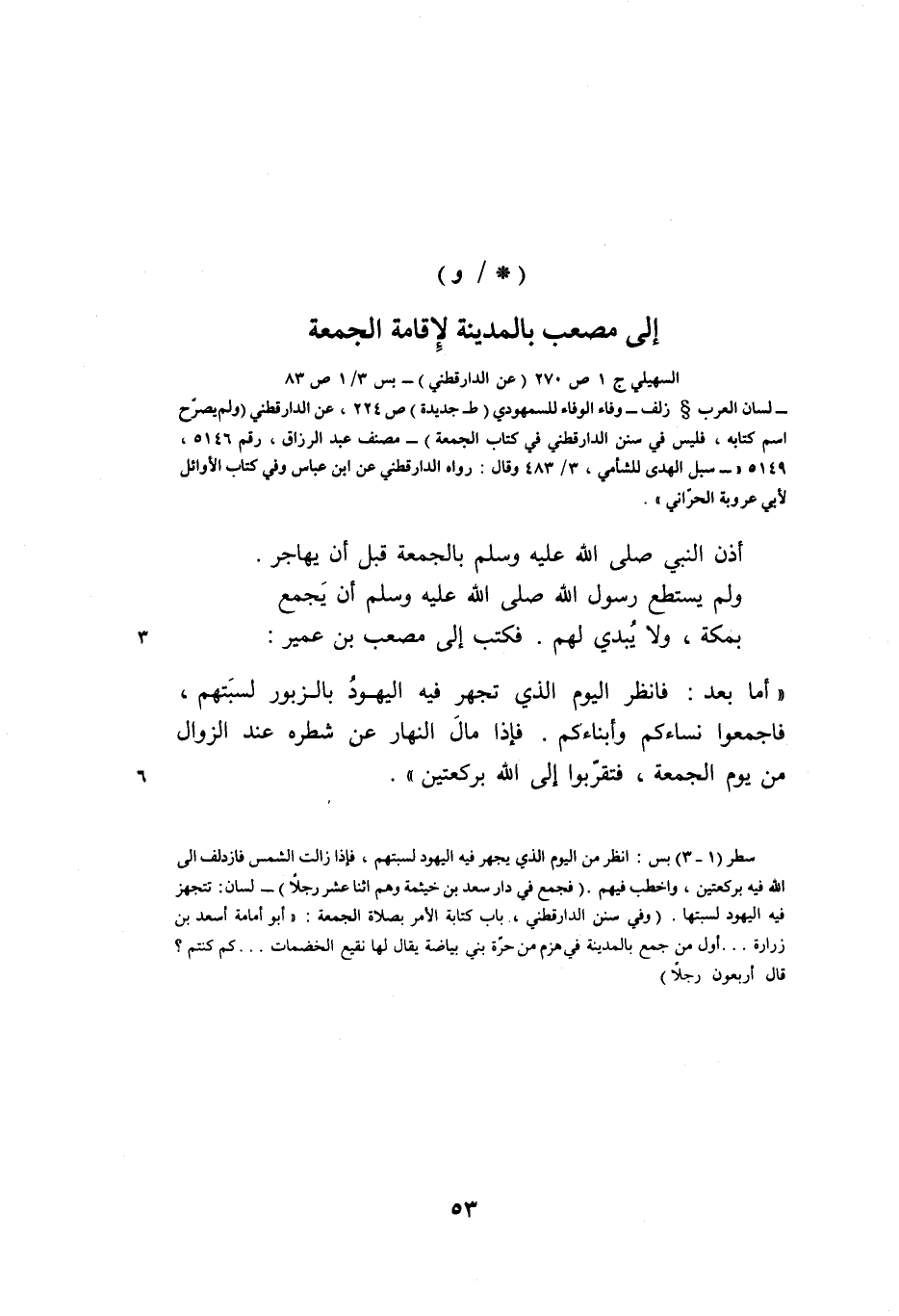 سطر (1- 3) بس: انظر من اليوم الذي يجهر فيه اليهود لسبتهم، فإذا زالت الشمس فازدلف الى الله فيه بركعتين، واخطب فيهم. (فجمع في دار سعد بن خيثمة وهم اثنا عشر رجلا) - لسان: تتجهز فيه اليهود لسبتها. (وفي سنن الدارقطني، باب كتابة الأمر بصلاة الجمعة: «أبو أمامة أسعد بن زرارة ... أول من جمع بالمدينة في هزم من حرّة بني بياضة يقال لها نقيع الخضمات ... كم كنتم؟