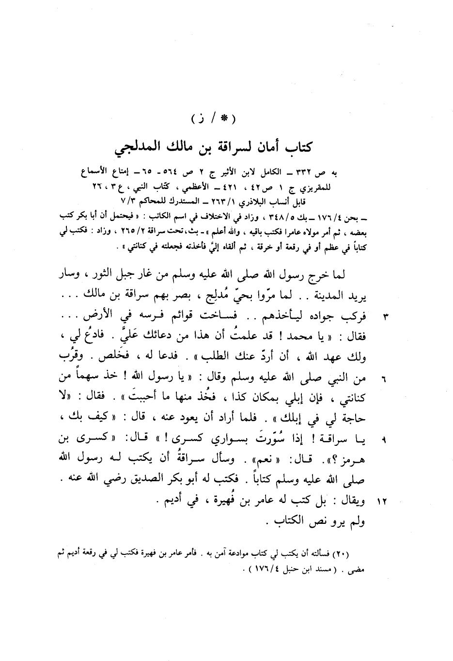 - بحن 4/ 176- بك 5/ 348، وزاد في الاختلاف في اسم الكاتب: «فيحتمل أن أبا بكر كتب بعضه، ثم أمر مولاه عامرا فكتب باقيه، والله أعلم» - بث، تحت سراقة 2/ 265، وزاد: فكتب لي كتابا في عظم أو في رقعة أو خرقة، ثم ألقاه إليّ فأخذته فجعلته في كنانتي» .
