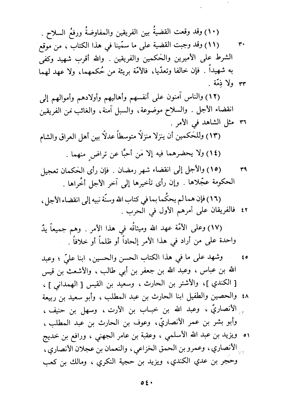 (11) وقد وجبت القضية على ما سمّينا في هذا الكتاب، من موقع الشرط على الأميرين والحكمين والفريقين. والله أقرب شهيد وكفى به شهيدا. فإن خالفا وتعدّيا، فالأمّة بريئة من حكمهما، ولا عهد لهما ولا ذمّة.
